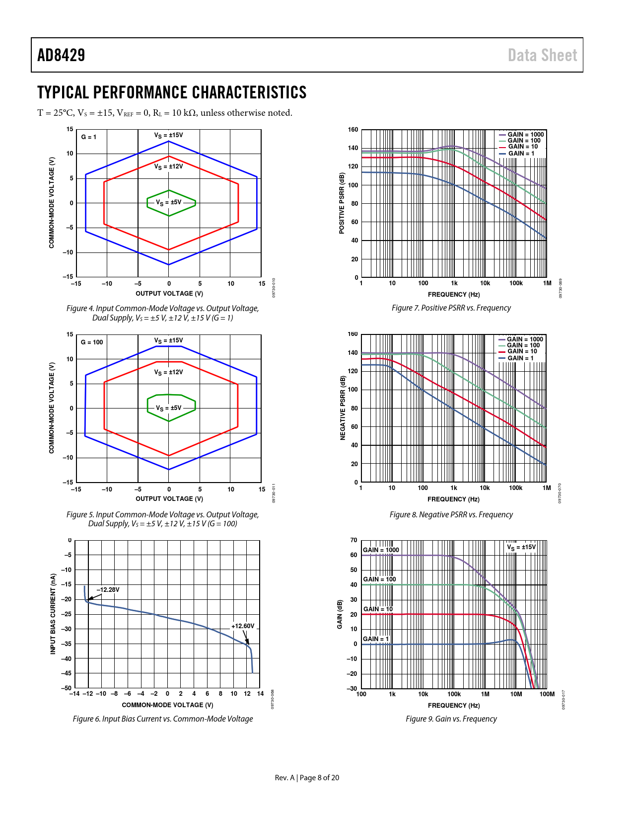 AD8429Data SheetTYPICAL PERFORMANCE CHARACTERISTICS T = 25°C, VS = ±15, VREF = 0, RL = 10 kΩ, unless otherwise noted. 15160G = 1VS = ±15VGAIN = 1000 GAIN = 100140GAIN = 1010GAIN = 1E (V)VS = ±12V120G)A5BT L(d 100RE VO0VDS = ±5V80IVE PSR-MOTNSI60–5POMMO O40C–1020–150–15–10–5051015 010 1101001k10k100k1M 069 OUTPUT VOLTAGE (V) 09730- FREQUENCY (Hz) 09730- Figure 4. Input Common-Mode Voltage vs. Output Voltage, Figure 7. Positive PSRR vs. Frequency Dual Supply, VS = ±5 V, ±12 V, ±15 V (G = 1) 15160GAIN = 1000G = 100VS = ±15VGAIN = 100140GAIN = 1010GAIN = 1120E (V)VS = ±12V)GBA5T(dL100RE VO0VDS = ±5V80IVE PSR-MOTNA60–5EG NMMO O40C–1020–150–15–10–5051015 011 1101001k10k100k1M 070 OUTPUT VOLTAGE (V)FREQUENCY (Hz) 09730- 09730- Figure 5. Input Common-Mode Voltage vs. Output Voltage, Figure 8. Negative PSRR vs. Frequency Dual Supply, VS = ±5 V, ±12 V, ±15 V (G = 100) 070GAIN = 1000VS = ±15V–560–1050A) nGAIN = 100(–1540–12.28VNT–2030B) dGAIN = 10–2520CURREN ( AIAS+12.60V–30G10BIGAIN = 1UT–350INP–40–10–45–20–50–30–14 –12 –10 –8–6–4–202468101214 068 1001k10k100k1M10M100M 017 COMMON-MODE VOLTAGE (V)FREQUENCY (Hz) 09730- 09730- Figure 6. Input Bias Current vs. Common-Mode Voltage Figure 9. Gain vs. Frequency Rev. A | Page 8 of 20 Document Outline FEATURES APPLICATIONS PIN CONNECTION DIAGRAM GENERAL DESCRIPTION REVISION HISTORY SPECIFICATIONS ABSOLUTE MAXIMUM RATINGS THERMAL RESISTANCE ESD CAUTION PIN CONFIGURATION AND FUNCTION DESCRIPTIONS TYPICAL PERFORMANCE CHARACTERISTICS THEORY OF OPERATION ARCHITECTURE RG Power Dissipation REFERENCE TERMINAL INPUT VOLTAGE RANGE LAYOUT Common-Mode Rejection Ratio over Frequency Power Supplies and Grounding Reference Pin INPUT BIAS CURRENT RETURN PATH INPUT PROTECTION Input Voltages Beyond the Rails Large Differential Input Voltage at High Gain IMAX RADIO FREQUENCY INTERFERENCE (RFI) CALCULATING THE NOISE OF THE INPUT STAGE Source Resistance Noise Voltage Noise of the Instrumentation Amplifier Current Noise of the Instrumentation Amplifier Total Noise Density Calculation OUTLINE DIMENSIONS ORDERING GUIDE