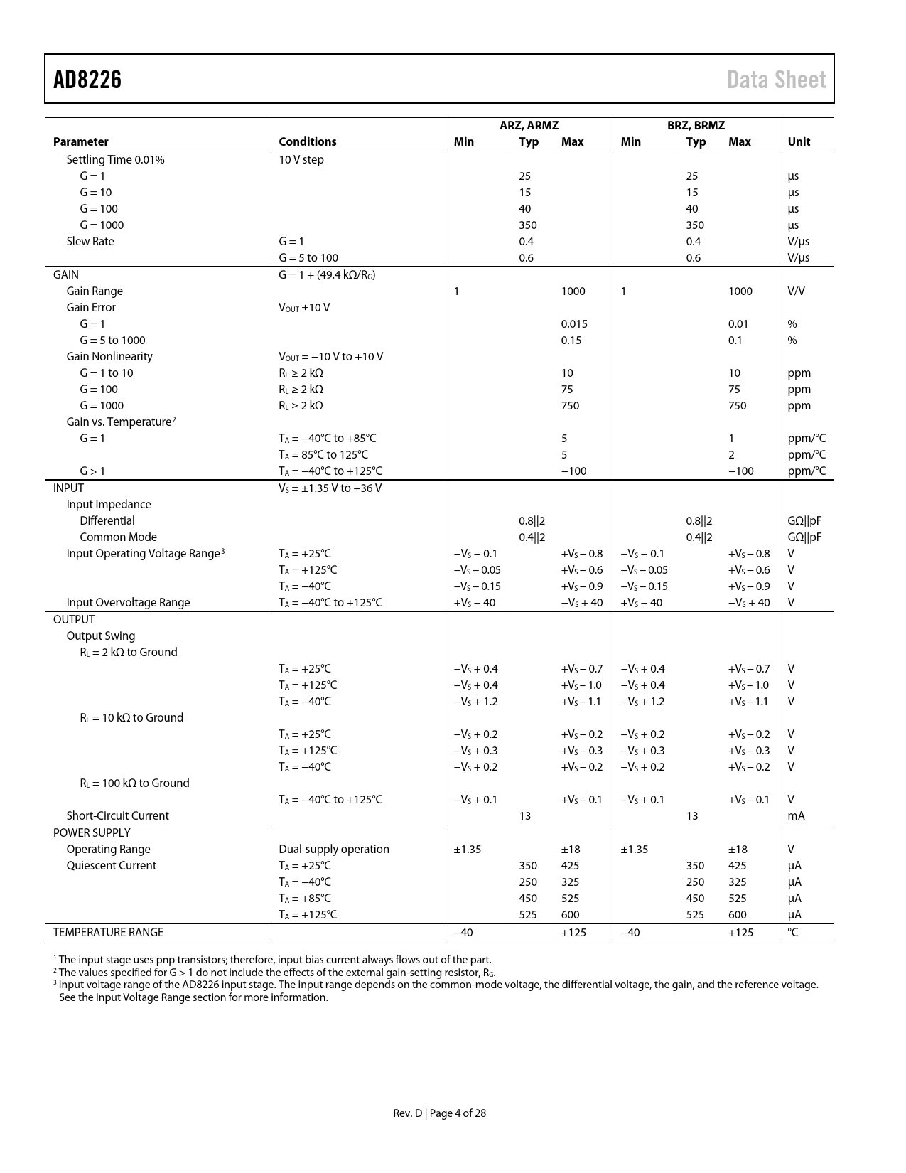 Páginas / Página28 / 4 — AD8226. Data Sheet. ARZ, ARMZ. BRZ, BRMZ. Parameter. Conditions. Min. …