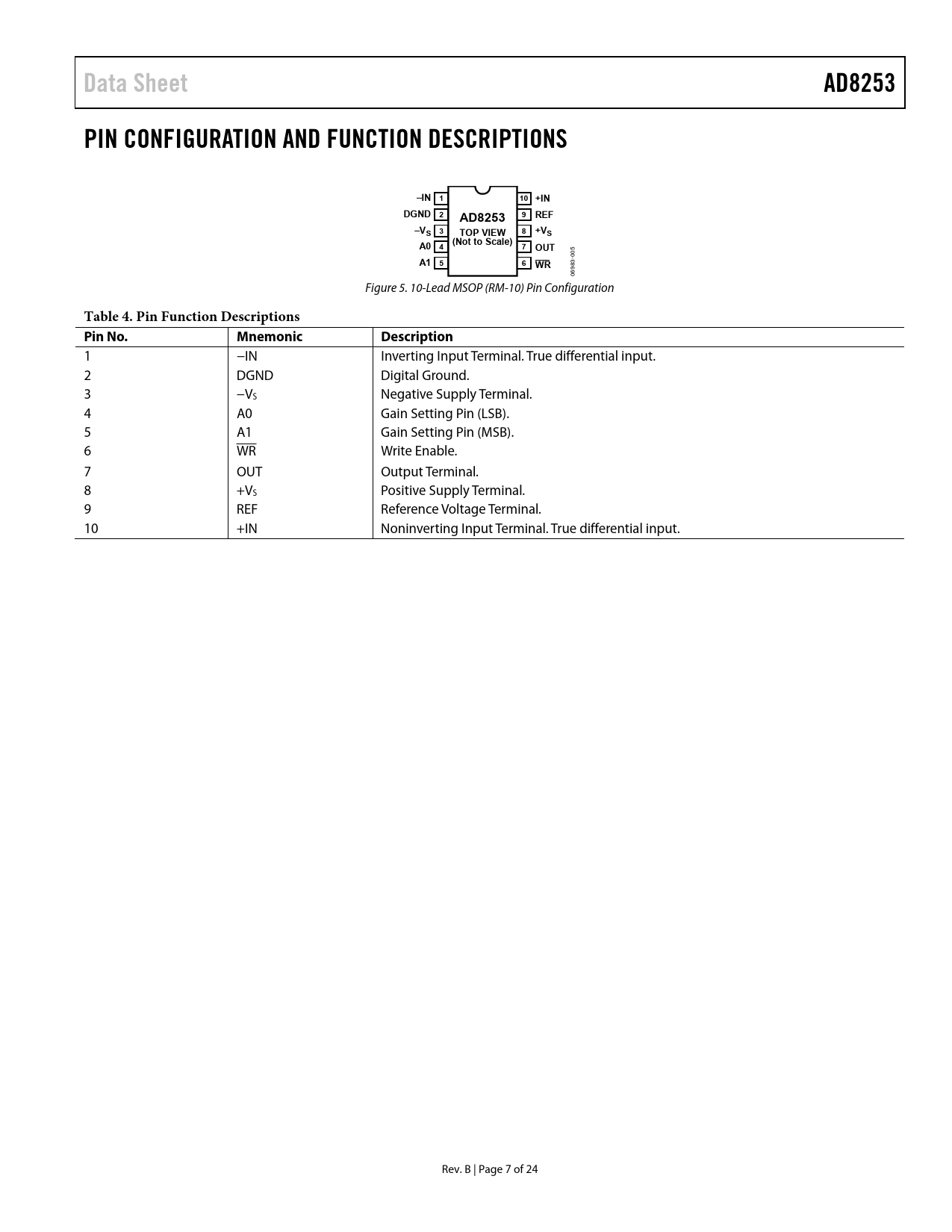 Data SheetAD8253PIN CONFIGURATION AND FUNCTION DESCRIPTIONS–IN 110 +INDGND 29REFAD8253–VS 38+VTOP VIEWSA0(Not to Scale)47OUT 5 A1 -00 56WR 983 06 Figure 5. 10-Lead MSOP (RM-10) Pin Configuration Table 4. Pin Function Descriptions Pin No.MnemonicDescription 1 −IN Inverting Input Terminal. True differential input. 2 DGND Digital Ground. 3 −VS Negative Supply Terminal. 4 A0 Gain Setting Pin (LSB). 5 A1 Gain Setting Pin (MSB). 6 WR Write Enable. 7 OUT Output Terminal. 8 +VS Positive Supply Terminal. 9 REF Reference Voltage Terminal. 10 +IN Noninverting Input Terminal. True differential input. Rev. B | Page 7 of 24 Document Outline FEATURES APPLICATIONS GENERAL DESCRIPTION FUNCTIONAL BLOCK DIAGRAM TABLE OF CONTENTS REVISION HISTORY SPECIFICATIONS TIMING DIAGRAM ABSOLUTE MAXIMUM RATINGS MAXIMUM POWER DISSIPATION ESD CAUTION PIN CONFIGURATION AND FUNCTION DESCRIPTIONS TYPICAL PERFORMANCE CHARACTERISTICS THEORY OF OPERATION GAIN SELECTION Transparent Gain Mode Latched Gain Mode Timing for Latched Gain Mode POWER SUPPLY REGULATION AND BYPASSING INPUT BIAS CURRENT RETURN PATH INPUT PROTECTION REFERENCE TERMINAL COMMON-MODE INPUT VOLTAGE RANGE LAYOUT Grounding Coupling Noise Common-Mode Rejection RF INTERFERENCE DRIVING AN ANALOG-TO-DIGITAL CONVERTER APPLICATIONS INFORMATION DIFFERENTIAL OUTPUT SETTING GAINS WITH A MICROCONTROLLER DATA ACQUISITION OUTLINE DIMENSIONS ORDERING GUIDE