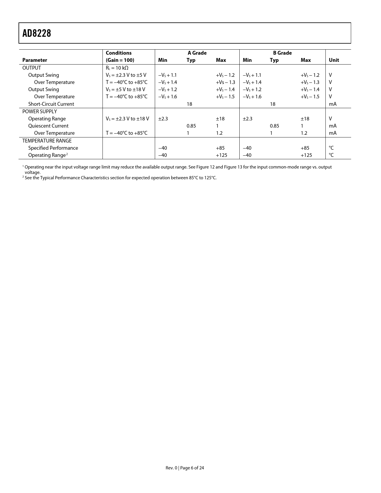 Páginas / Página24 / 6 — AD8228. Conditions. A Grade. B Grade. Parameter. (Gain = 100). Min. Typ. …