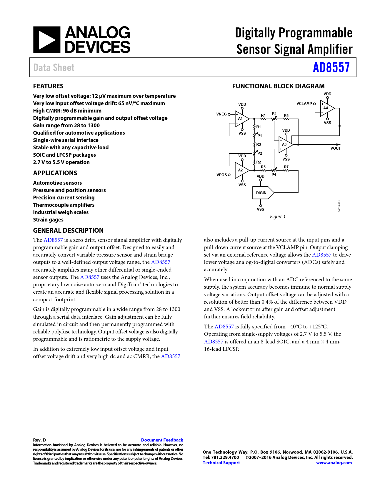 Digitally Programmable. Sensor Signal Amplifier. Data Sheet. AD8557. FEATURES. FUNCTIONAL BLOCK DIAGRAM. VDD