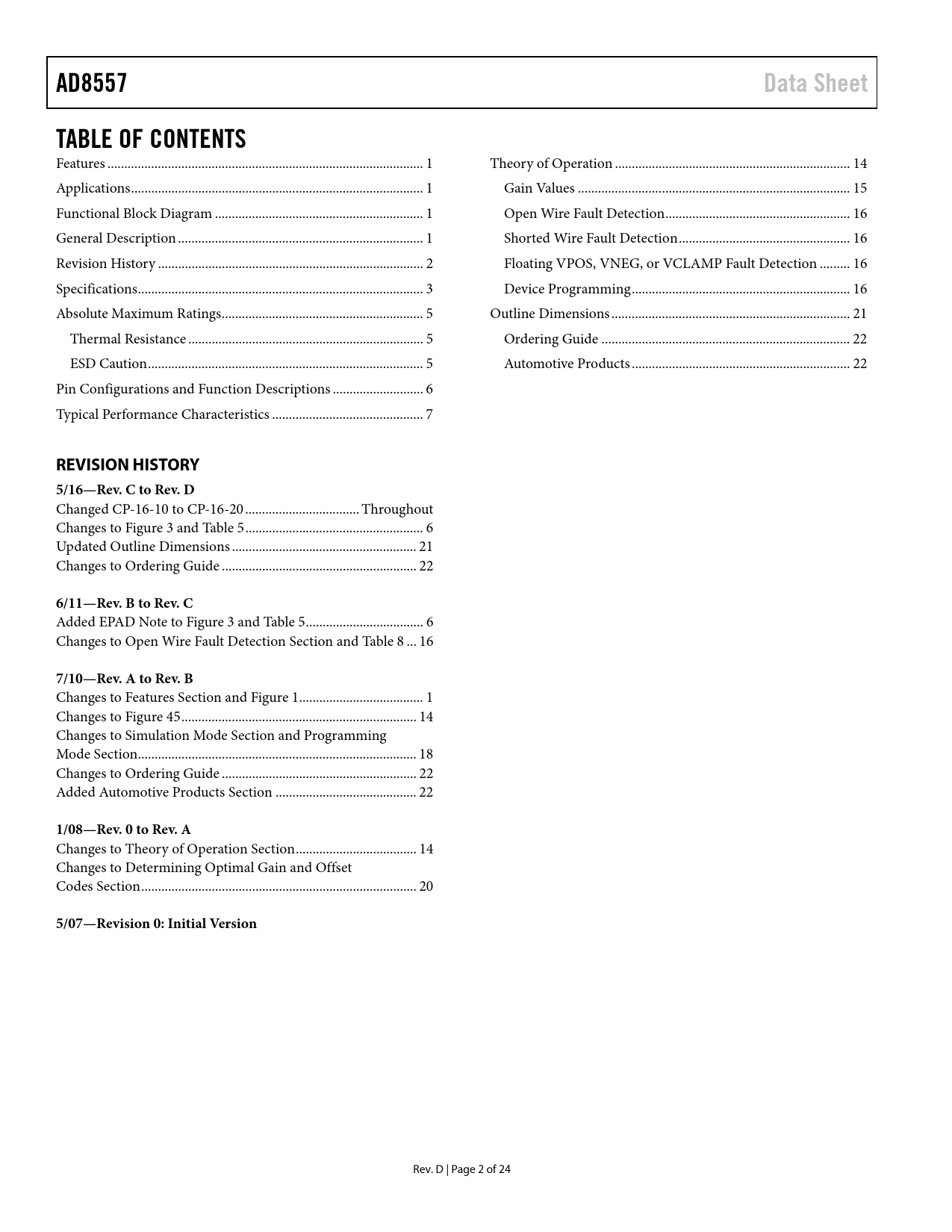 AD8557 Data Sheet TABLE OF CONTENTS REVISION HISTORY 5/16—Rev C to Rev D 6/11—Rev B to Rev C 7/10—Rev A to Rev B
