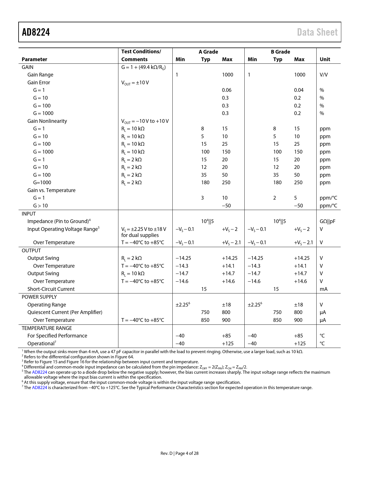 Páginas / Página28 / 4 — AD8224. Data Sheet. Test Conditions/. A Grade. B Grade. Parameter. …