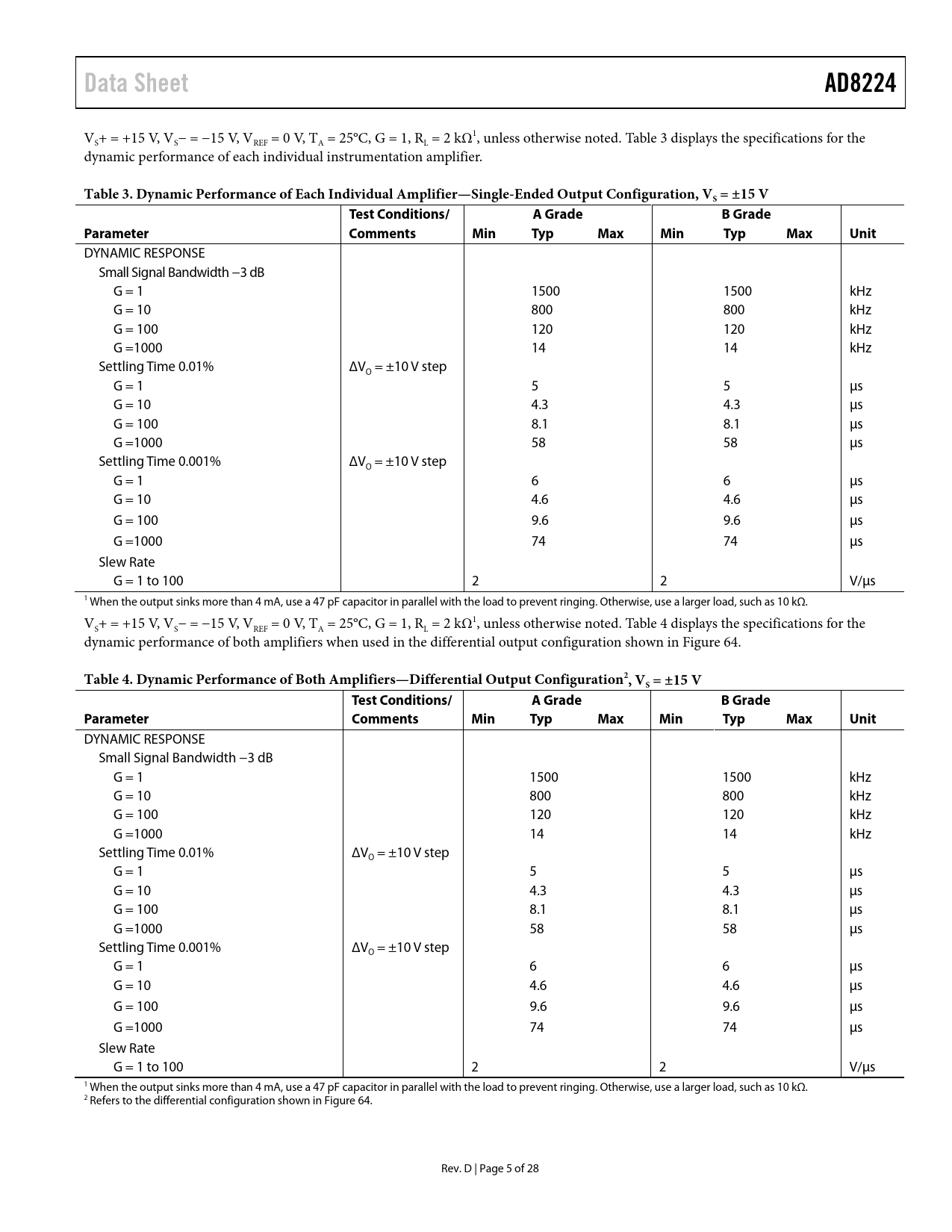 Data Sheet AD8224 Table 3 Dynamic Performance of Each Individual Amplifier—Single-Ended Output Configuration, VS = ±15 V