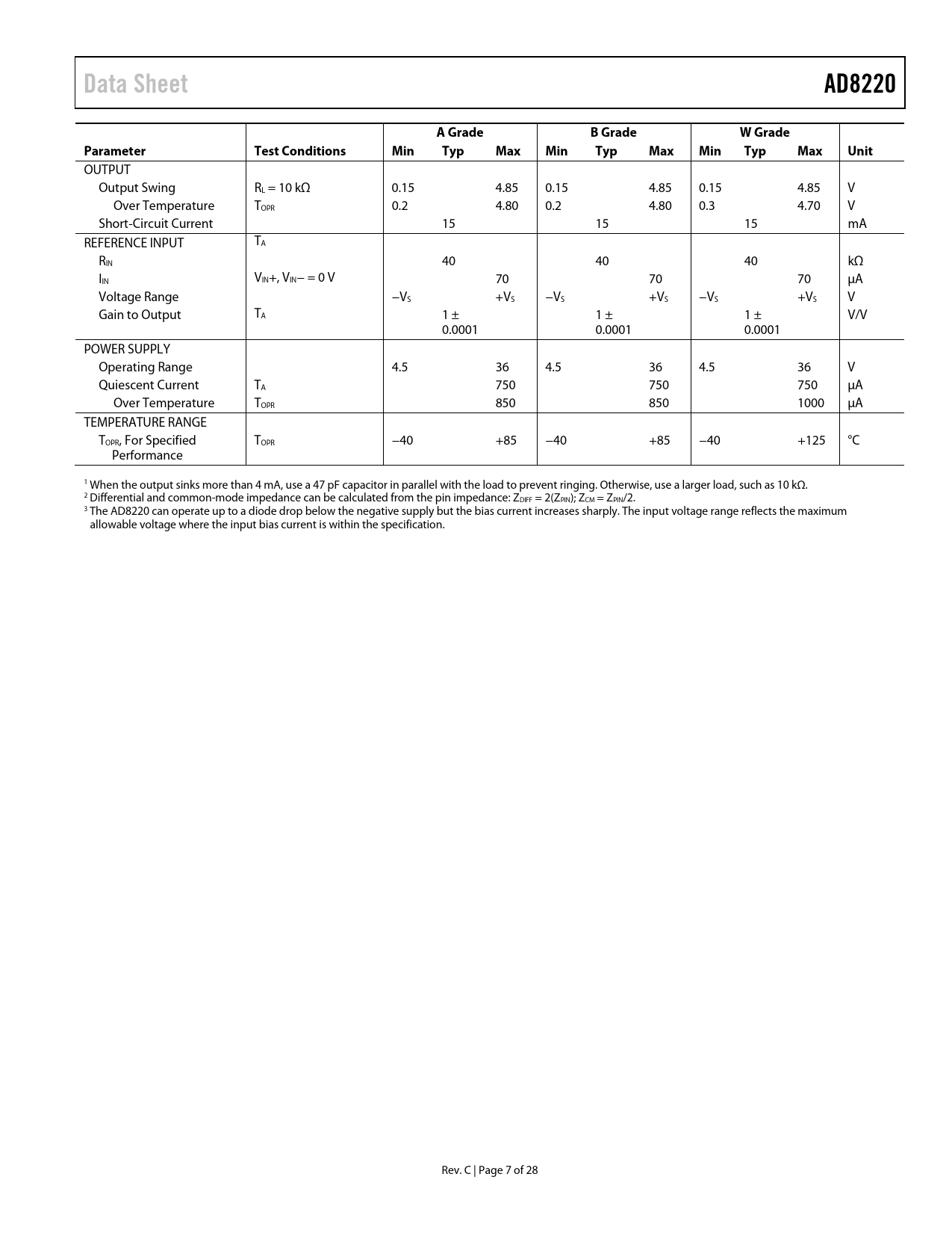 Páginas / Página28 / 7 — Data Sheet. AD8220. A Grade. B Grade. W Grade. Parameter. Test …
