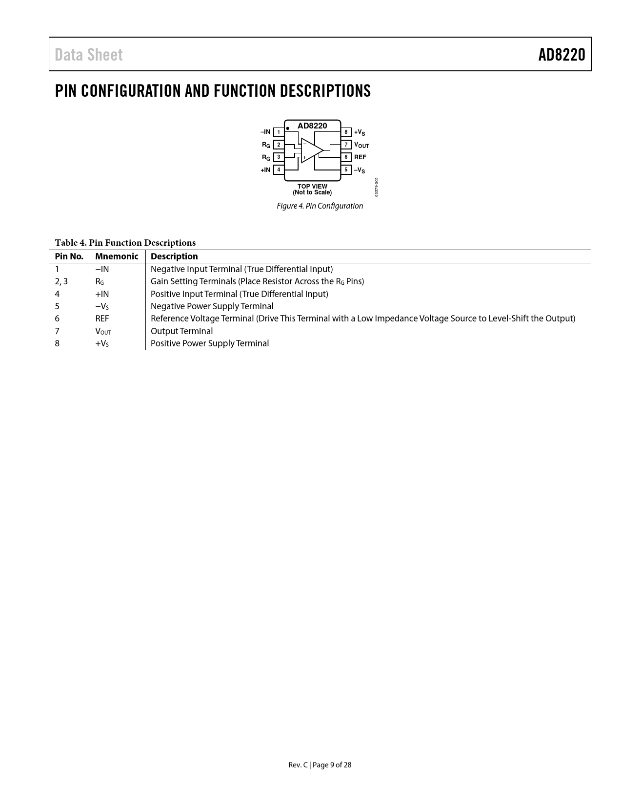 Páginas / Página28 / 9 — Data Sheet. AD8220. PIN CONFIGURATION AND FUNCTION DESCRIPTIONS. –IN. …