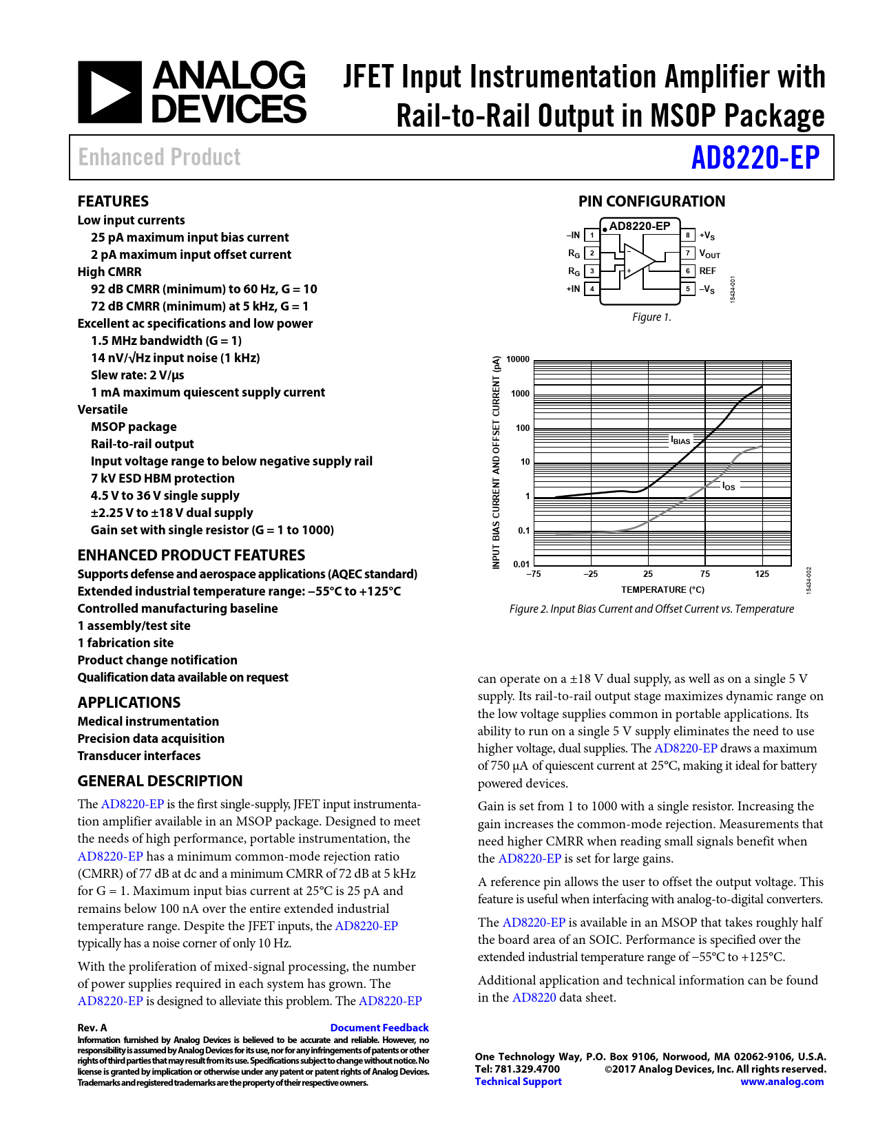 JFET Input Instrumentation Amplifier with. Rail-to-Rail Output in MSOP Package. Enhanced Product. AD8220-EP. FEATURES