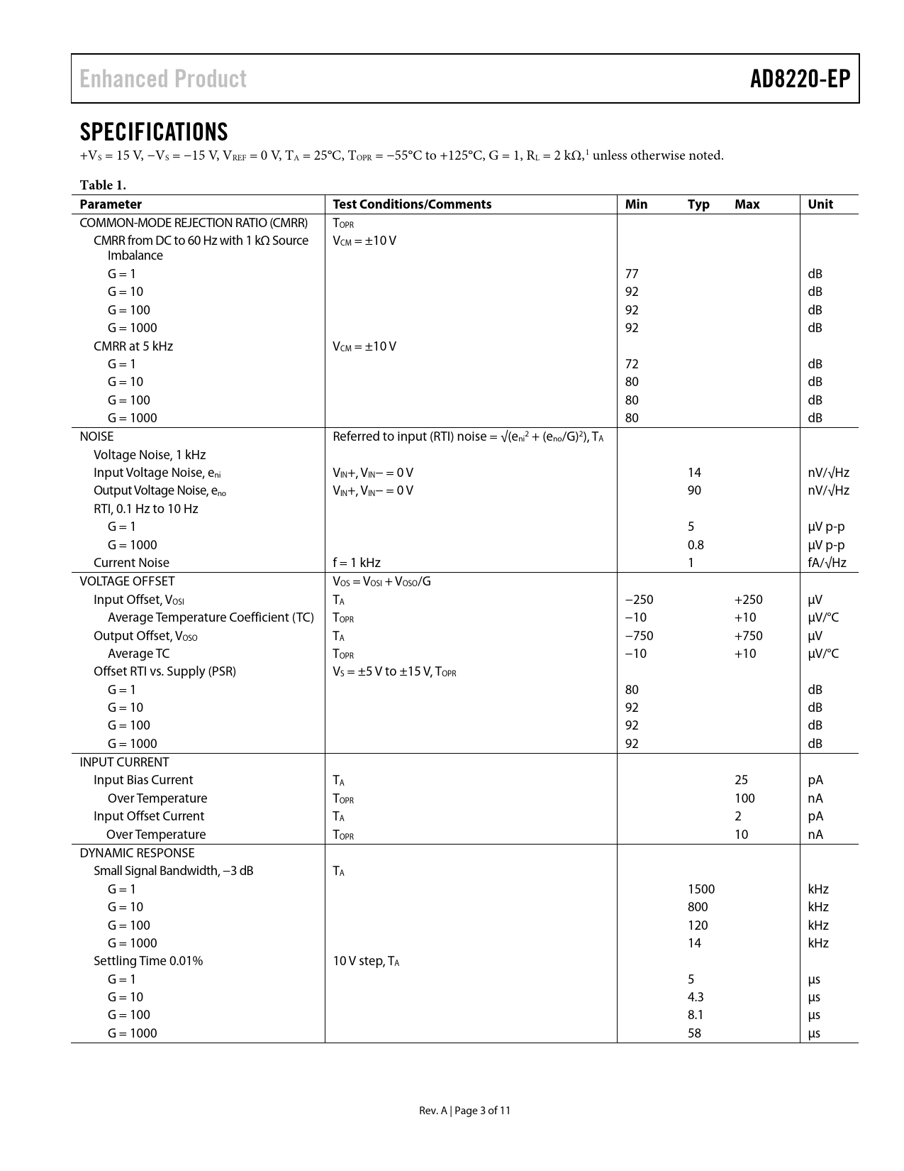 Enhanced Product AD8220-EP SPECIFICATIONS Table 1 Parameter Test Conditions/Comments Min Typ Max Unit