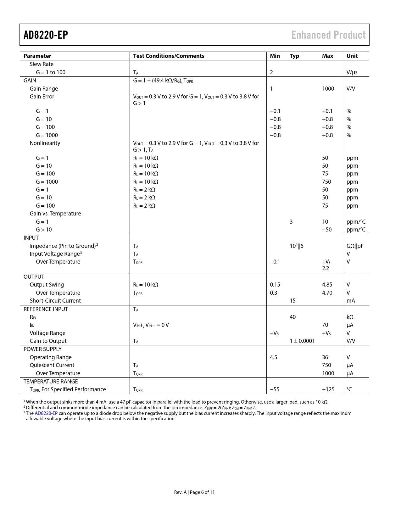 AD8220-EPEnhanced ProductParameterTest Conditions/CommentsMinTypMaxUnit Slew Rate G = 1 to 100 TA 2 V/µs GAIN G = 1 + (49.4 kΩ/RG), TOPR Gain Range 1 1000 V/V Gain Error VOUT = 0.3 V to 2.9 V for G = 1, VOUT = 0.3 V to 3.8 V for G > 1 G = 1 −0.1 +0.1 % G = 10 −0.8 +0.8 % G = 100 −0.8 +0.8 % G = 1000 −0.8 +0.8 % Nonlinearity VOUT = 0.3 V to 2.9 V for G = 1, VOUT = 0.3 V to 3.8 V for G > 1, TA G = 1 RL = 10 kΩ 50 ppm G = 10 RL = 10 kΩ 50 ppm G = 100 RL = 10 kΩ 75 ppm G = 1000 RL = 10 kΩ 750 ppm G = 1 RL = 2 kΩ 50 ppm G = 10 RL = 2 kΩ 50 ppm G = 100 RL = 2 kΩ 75 ppm Gain vs. Temperature G = 1 3 10 ppm/°C G > 10 −50 ppm/°C INPUT Impedance (Pin to Ground)2 TA 104||6 GΩ||pF Input Voltage Range3 TA V Over Temperature TOPR −0.1 +VS − V 2.2 OUTPUT Output Swing RL = 10 kΩ 0.15 4.85 V Over Temperature TOPR 0.3 4.70 V Short-Circuit Current 15 mA REFERENCE INPUT TA RIN 40 kΩ IIN VIN+, VIN− = 0 V 70 µA Voltage Range −VS +VS V Gain to Output TA 1 ± 0.0001 V/V POWER SUPPLY Operating Range 4.5 36 V Quiescent Current TA 750 µA Over Temperature TOPR 1000 µA TEMPERATURE RANGE TOPR, For Specified Performance TOPR −55 +125 °C 1 When the output sinks more than 4 mA, use a 47 pF capacitor in parallel with the load to prevent ringing. Otherwise, use a larger load, such as 10 kΩ. 2 Differential and common-mode impedance can be calculated from the pin impedance: ZDIFF = 2(ZPIN); ZCM = ZPIN/2. 3 The AD8220-EP can operate up to a diode drop below the negative supply but the bias current increases sharply. The input voltage range reflects the maximum allowable voltage where the input bias current is within the specification. Rev. A | Page 6 of 11 Document Outline FEATURES ENHANCED PRODUCT FEATURES APPLICATIONS GENERAL DESCRIPTION PIN CONFIGURATION REVISION HISTORY SPECIFICATIONS ABSOLUTE MAXIMUM RATINGS ESD CAUTION PIN CONFIGURATION AND FUNCTION DESCRIPTIONS TYPICAL PERFORMANCE CHARACTERISTICS OUTLINE DIMENSIONS ORDERING GUIDE