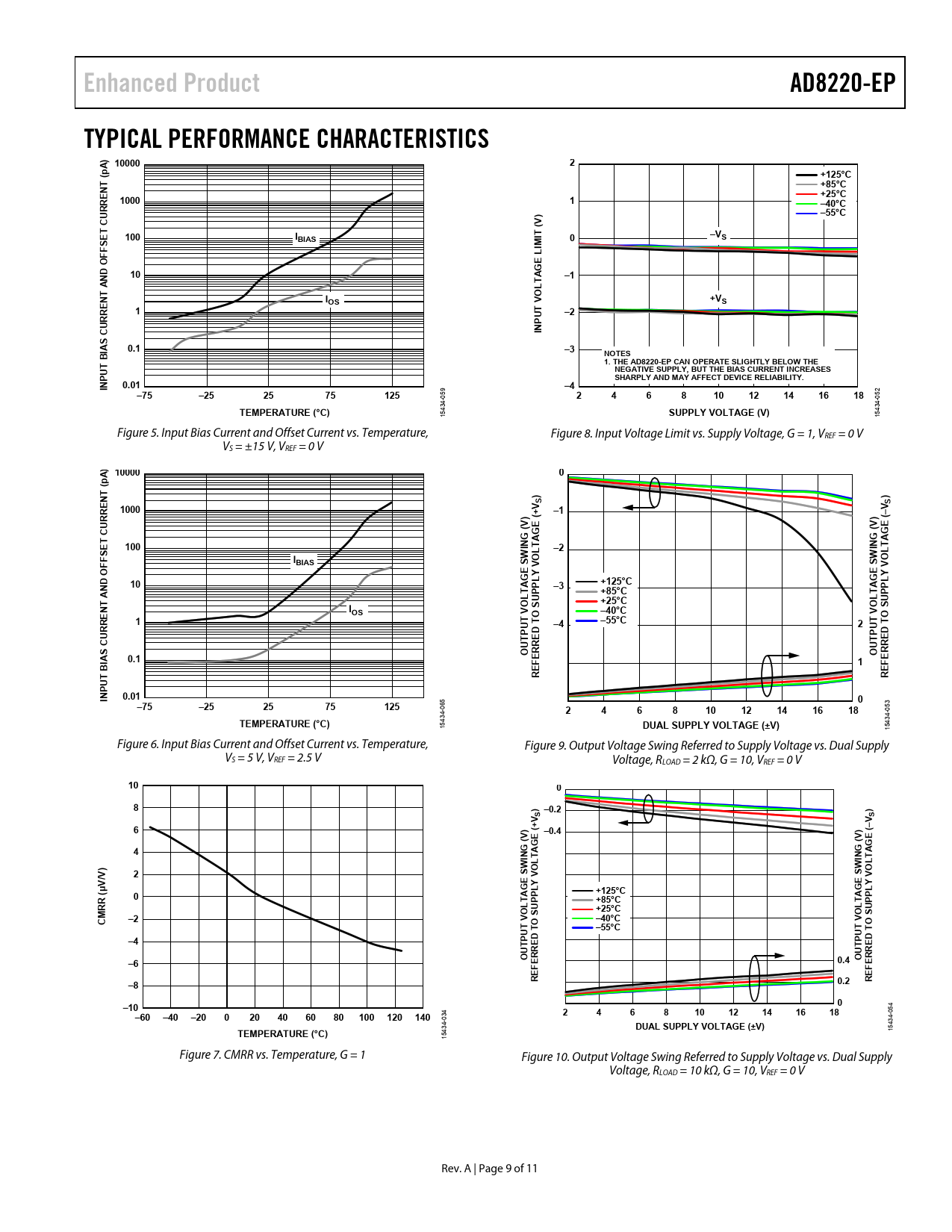 Enhanced ProductAD8220-EPTYPICAL PERFORMANCE CHARACTERISTICS100002(pA)+125°CNT+85°C+25°C10001–40°C–55°CV)100IBIASIT (0–VSFFSET CURRELIM GE10–1AND OOLTANTIOS+VS1T V–2PUCURREINAS0.1–3BINOTES1. THE AD8220-EP CAN OPERATE SLIGHTLY BELOW THEUTNEGATIVE SUPPLY, BUT THE BIAS CURRENT INCREASESSHARPLY AND MAY AFFECT DEVICE RELIABILITY.INP0.01–4–75–252575125 059 24681012141618 052 TEMPERATURE (°C) 15434- SUPPLY VOLTAGE (V) 15434- Figure 5. Input Bias Current and Offset Current vs. Temperature, Figure 8. Input Voltage Limit vs. Supply Voltage, G = 1, VREF = 0 V VS = ±15 V, VREF = 0 V 100000(pA) NT))1000V SV S–1V) E (+V) E (–G ( GG ( G100–2WIN LTAWIN LTAFFSET CURREIBIASSSGE Y VOGE Y VO10–3+125°CAND OPPL+85°CPPL+25°CNTIOLTAOLTAOSSUSUO–40°CO1T V–55°CT VU T–42U TTP EDTP EDCURRERRASOUOU0.1ERER1BIEFEFRRUT INP0.010–75–252575125 065 24681012141618 053 TEMPERATURE (°C) 15434- DUAL SUPPLY VOLTAGE (±V) 15434- Figure 6. Input Bias Current and Offset Current vs. Temperature, Figure 9. Output Voltage Swing Referred to Supply Voltage vs. Dual Supply VS = 5 V, VREF = 2.5 V Voltage, RLOAD = 2 kΩ, G = 10, VREF = 0 V 1008) –0.2)V SV S6V) E (+ –0.4V) E (–GG4G (G (WIN LTAWIN LTAV)2SSV/GE Y VOGE Y VO(μ+125°CR0PPL+85°CPPLMROLTA SU+25°COLTA SUC–2–40°CT V O–55°CT V OU TU T–4TP EDEDRTP R–6OU ER0.4 OU EREFEFRR–80.2–100 054 –60 –40 –20020406080100 120 14024681012141618 034 DUAL SUPPLY VOLTAGE (±V)TEMPERATURE (°C) 15434- 15434- Figure 7. CMRR vs. Temperature, G = 1 Figure 10. Output Voltage Swing Referred to Supply Voltage vs. Dual Supply Voltage, RLOAD = 10 kΩ, G = 10, VREF = 0 V Rev. A | Page 9 of 11 Document Outline FEATURES ENHANCED PRODUCT FEATURES APPLICATIONS GENERAL DESCRIPTION PIN CONFIGURATION REVISION HISTORY SPECIFICATIONS ABSOLUTE MAXIMUM RATINGS ESD CAUTION PIN CONFIGURATION AND FUNCTION DESCRIPTIONS TYPICAL PERFORMANCE CHARACTERISTICS OUTLINE DIMENSIONS ORDERING GUIDE