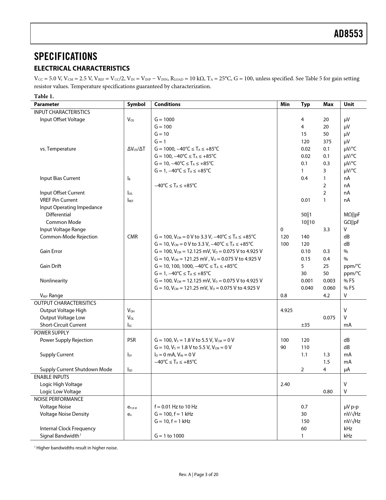 AD8553. SPECIFICATIONS ELECTRICAL CHARACTERISTICS. Table 1. Parameter Symbol. Conditions. Min. Typ. Max. Unit