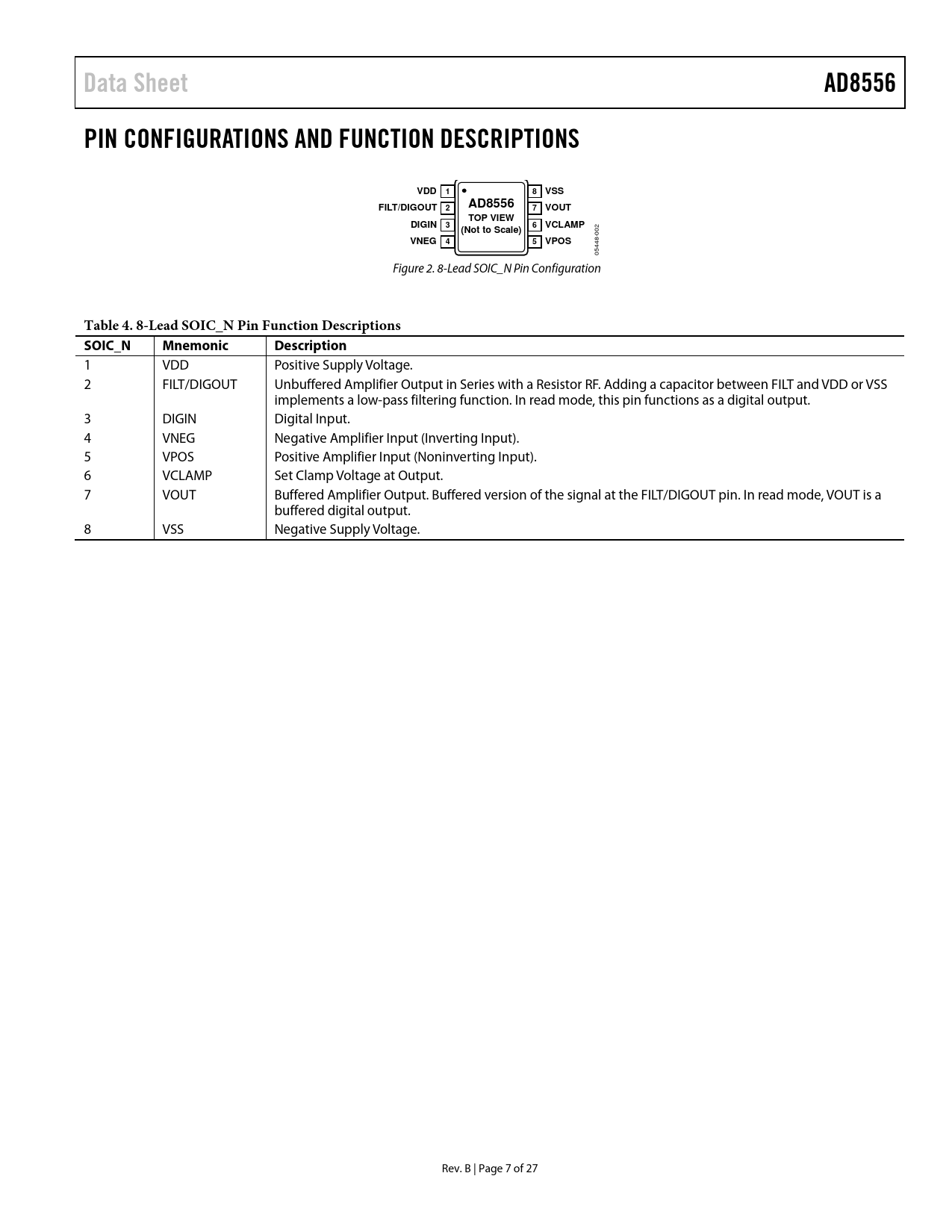 Data SheetAD8556PIN CONFIGURATIONS AND FUNCTION DESCRIPTIONSVDD18VSSFILT/DIGOUTAD855627VOUTTOP VIEWDIGIN 36VCLAMP(Not to Scale) 002 VNEG45VPOS 05448- Figure 2. 8-Lead SOIC_N Pin Configuration Table 4. 8-Lead SOIC_N Pin Function Descriptions SOIC_NMnemonicDescription 1 VDD Positive Supply Voltage. 2 FILT/DIGOUT Unbuffered Amplifier Output in Series with a Resistor RF. Adding a capacitor between FILT and VDD or VSS implements a low-pass filtering function. In read mode, this pin functions as a digital output. 3 DIGIN Digital Input. 4 VNEG Negative Amplifier Input (Inverting Input). 5 VPOS Positive Amplifier Input (Noninverting Input). 6 VCLAMP Set Clamp Voltage at Output. 7 VOUT Buffered Amplifier Output. Buffered version of the signal at the FILT/DIGOUT pin. In read mode, VOUT is a buffered digital output. 8 VSS Negative Supply Voltage. Rev. B | Page 7 of 27 Document Outline FEATURES APPLICATIONS FUNCTIONAL BLOCK DIAGRAM TABLE OF CONTENTS REVISION HISTORY GENERAL DESCRIPTION SPECIFICATIONS ELECTRICAL SPECIFICATIONS ABSOLUTE MAXIMUM RATINGS THERMAL RESISTANCE ESD CAUTION PIN CONFIGURATIONS AND FUNCTION DESCRIPTIONS TYPICAL PERFORMANCE CHARACTERISTICS THEORY OF OPERATION GAIN VALUES OPEN WIRE FAULT DETECTION SHORTED WIRE FAULT DETECTION FLOATING VPOS, VNEG, OR VCLAMP FAULT DETECTION DEVICE PROGRAMMING Digital Interface Initial State Simulation Mode Programming Mode Parity Error Detection Read Mode Sense Current Programming Procedure Determining Optimal Gain and Offset Codes EMI/RFI PERFORMANCE OUTLINE DIMENSIONS ORDERING GUIDE
