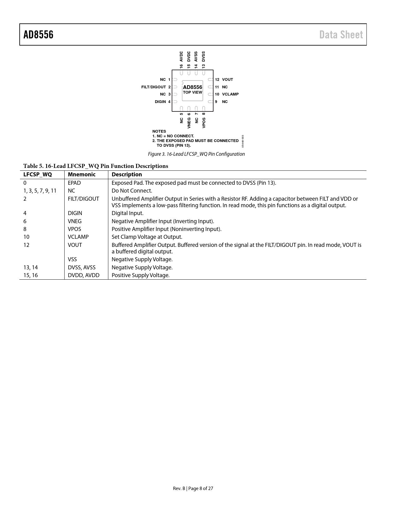 AD8556. Data Sheet. VSS. NC 1. 12 VOUT. FILT/DIGOUT 2. 11 NC. AD8556 TOP VIEW. NC 3. 10 VCLAMP. DIGIN 4. VPO. NOTES 1. NC = NO CONNECT