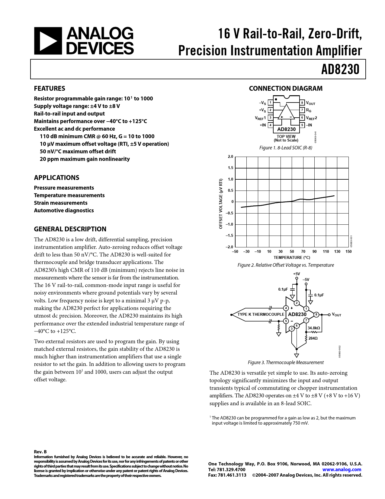 Two external resistors are used to program the gain. By using 2 matched external resistors, the gain stability of the AD8230 is 00 3- much higher than instrumentation amplifiers that use a single 06 05 resistor to set the gain. In addition to allowing users to program Figure 3. Thermocouple Measurement the gain between 101 and 1000, users can adjust the output The AD8230 is versatile yet simple to use. Its auto-zeroing offset voltage. topology significantly minimizes the input and output transients typical of commutating or chopper instrumentation amplifiers. The AD8230 operates on ±4 V to ±8 V (+8 V to +16 V) supplies and is available in an 8-lead SOIC. 1 The AD8230 can be programmed for a gain as low as 2, but the maximum input voltage is limited to approximately 750 mV.