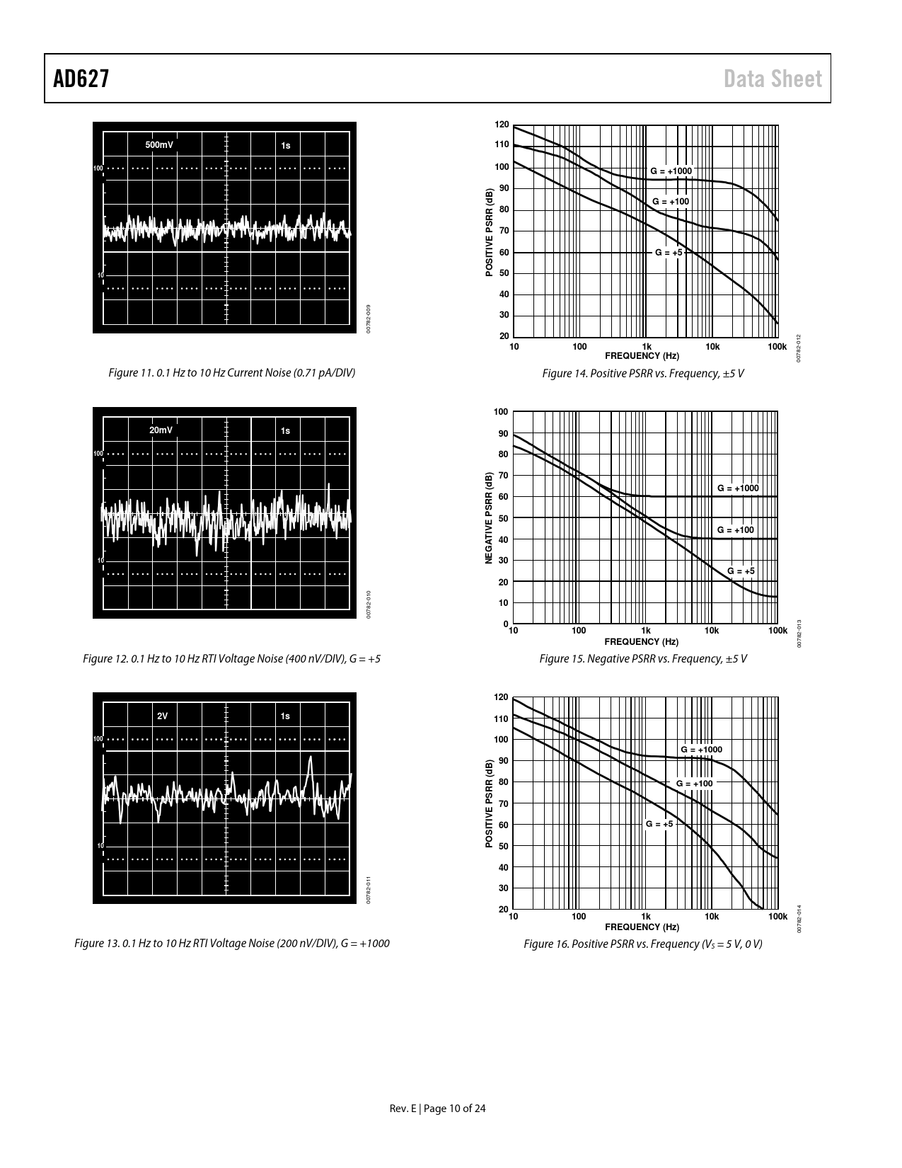 AD627Data Sheet120500mV1s110100100G = +1000) 90B dG = +100( R 80R70IVE PS T 60G = +5SI10PO 5040 9 -00 30 782 00 20 2 01 101001k10k100k 2- FREQUENCY (Hz) 78 00 Figure 11. 0.1 Hz to 10 Hz Current Noise (0.71 pA/DIV) Figure 14. Positive PSRR vs. Frequency, ±5 V 10020mV 1s 1s901008070B) dG = +100060RR ( S P 50E IVG = +10040AT G E10N 30G = +520 10 0 2- 10 78 00 0 3 101001k10k100k 01 2- FREQUENCY (Hz) 78 00 Figure 12. 0.1 Hz to 10 Hz RTI Voltage Noise (400 nV/DIV), G = +5 Figure 15. Negative PSRR vs. Frequency, ±5 V 1202V1s110100100G = +1000) 90B d ( R 80G = +100SR70IVE P T 60G = +5SI10PO 5040 11 0 2- 30 78 00 20 14 101001k10k100k 0 2- FREQUENCY (Hz) 78 00 Figure 13. 0.1 Hz to 10 Hz RTI Voltage Noise (200 nV/DIV), G = +1000 Figure 16. Positive PSRR vs. Frequency (VS = 5 V, 0 V) Rev. E | Page 10 of 24 Document Outline Features Applications Functional Block Diagram General Description Table of Contents Revision History Specifications Single Supply Dual Supply Dual and Single Supplies Absolute Maximum Ratings ESD Caution Pin Configurations and Function Descriptions Typical Performance Characteristics Theory of Operation Using the AD627 Basic Connections Setting the Gain Reference Terminal Input Range Limitations in Single-Supply Applications Output Buffering Input and Output Offset Errors Make vs. Buy: A Typical Application Error Budget Errors Due to AC CMRR Ground Returns for Input Bias Currents Layout and Grounding Input Protection RF Interference Applications Circuits Classic Bridge Circuit 4 mA to 20 mA Single-Supply Receiver Thermocouple Amplifier Outline Dimensions Ordering Guide
