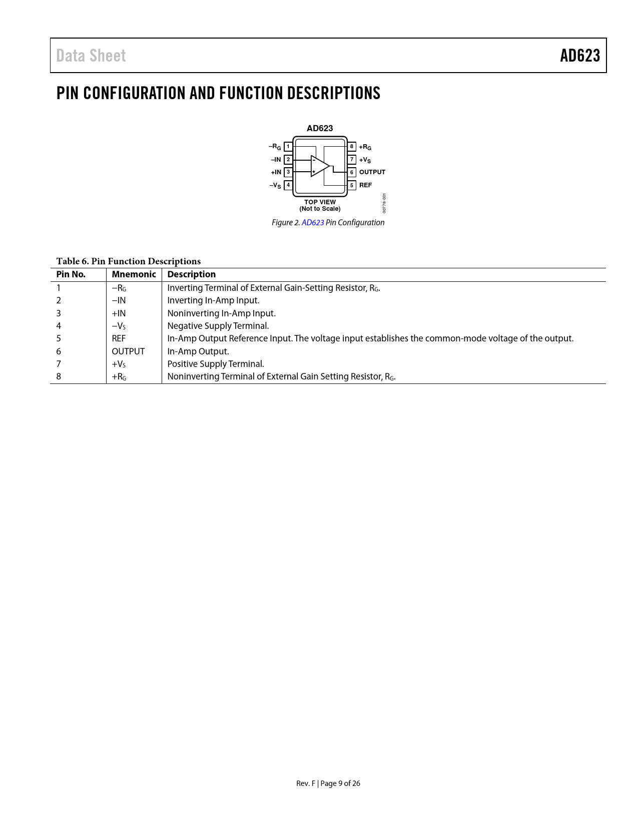 Data Sheet AD623 PIN CONFIGURATION AND FUNCTION DESCRIPTIONS +RG –IN 2 +VS +IN 3 OUTPUT REF TOP VIEW (Not to Scale)