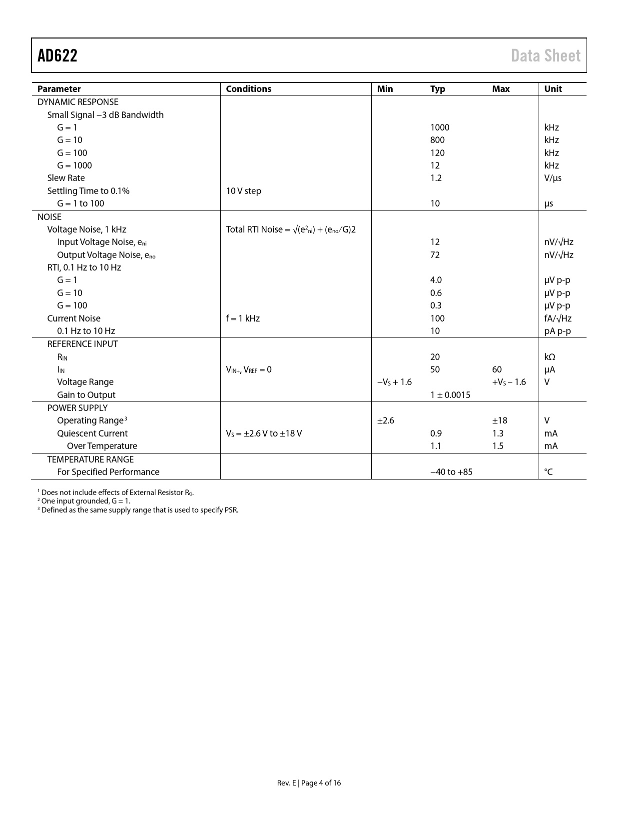 AD622 Data Sheet Parameter Conditions Min Typ Max Unit