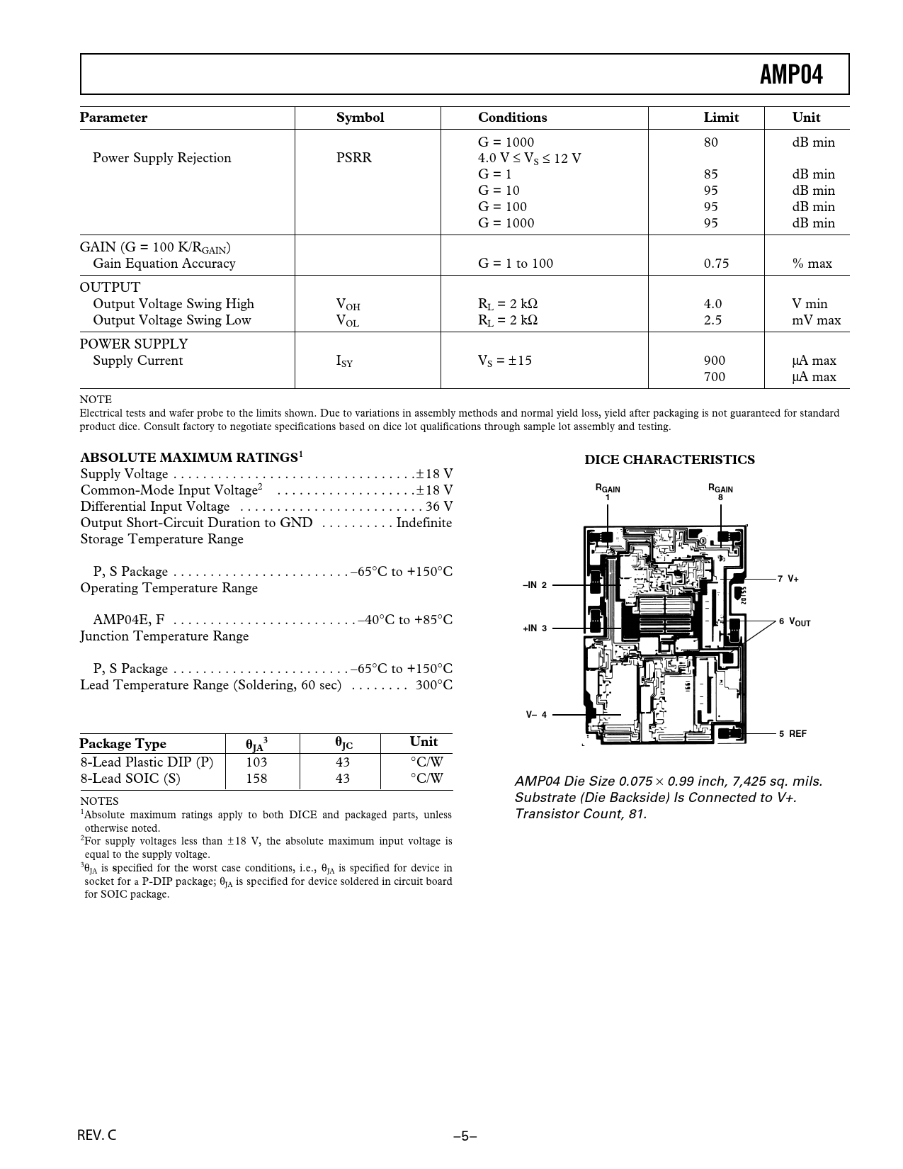 AMP04 Parameter Symbol Conditions Limit Unit ABSOLUTE MAXIMUM RATINGS1 DICE CHARACTERISTICS RGAIN 7 V+ –IN 2 6 VOUT +IN 3 V– 4 5 REF