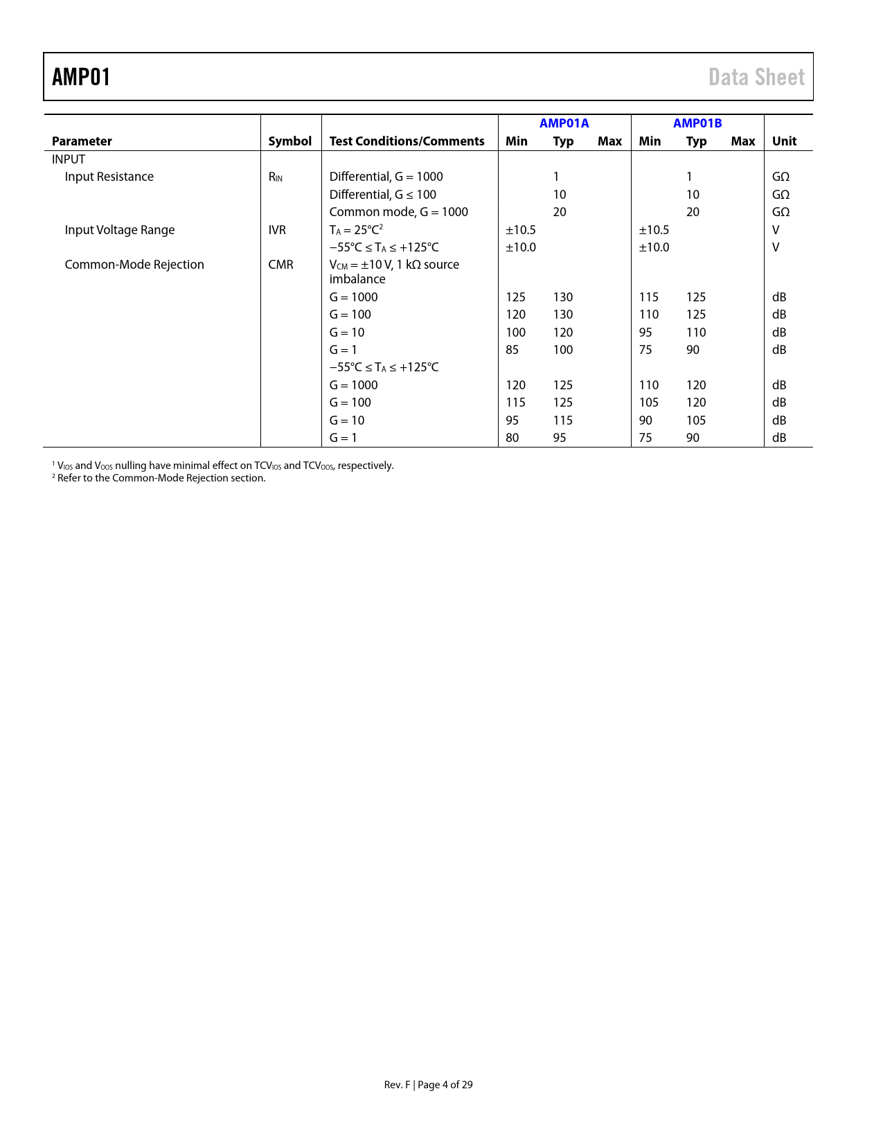 AMP01 Data Sheet AMP01A AMP01B Parameter Sy Te mbol st Conditions/Comments Min Typ Max Min Typ Max Unit