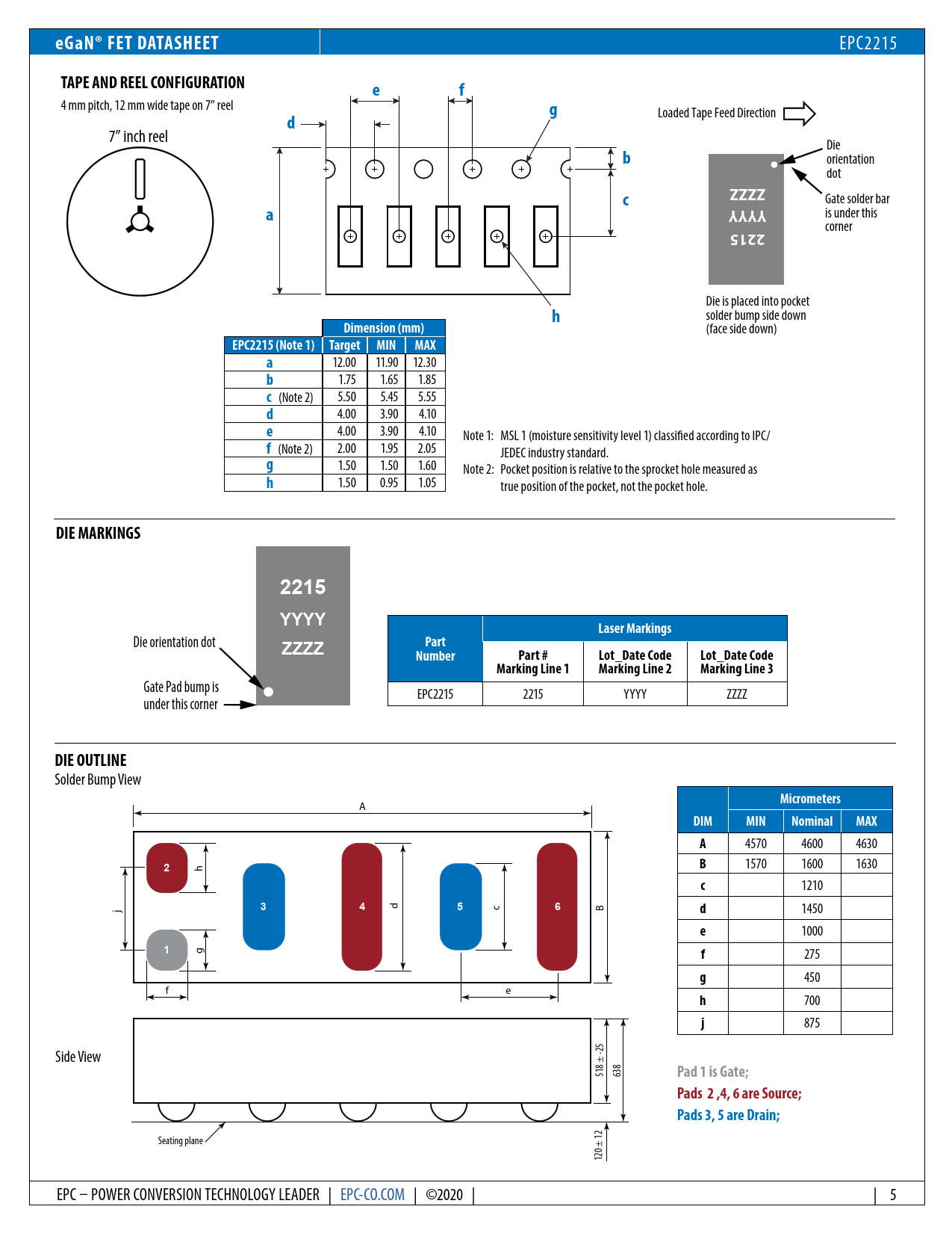eGaN® FET DATASHEET. TAPE AND REEL CONFIGURATION. Z Z. YYY. 2215. DIM. Dimension (mm). EPC2215 (Note 1) Target MIN. MAX. DIE MARKINGS