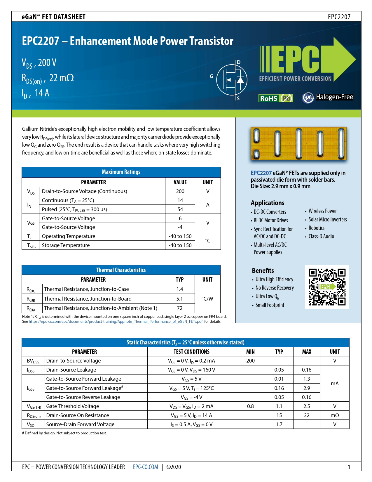BVDSS Drain-to-Source Voltage VGS = 0 V, ID = 0.2 mA 200 V IDSS Drain-Source Leakage VGS = 0 V, VDS = 160 V 0.05 0.16 Gate-to-Source Forward Leakage VGS = 5 V 0.01 1.3 mA IGSS Gate-to-Source Forward Leakage# VGS = 5 V, TJ = 125°C 0.16 2.9 Gate-to-Source Reverse Leakage VGS = -4 V 0.05 0.16 VGS(TH) Gate Threshold Voltage VDS = VGS, ID = 2 mA 0.8 1.1 2.5 V RDS(on) Drain-Source On Resistance VGS = 5 V, ID = 14 A 15 22 mΩ VSD Source-Drain Forward Voltage IS = 0.5 A, VGS = 0 V 1.7 V # Defined by design. Not subject to production test. EPC – POWER CONVERSION TECHNOLOGY LEADER | EPC-CO.COM | ©2020 | | 1
