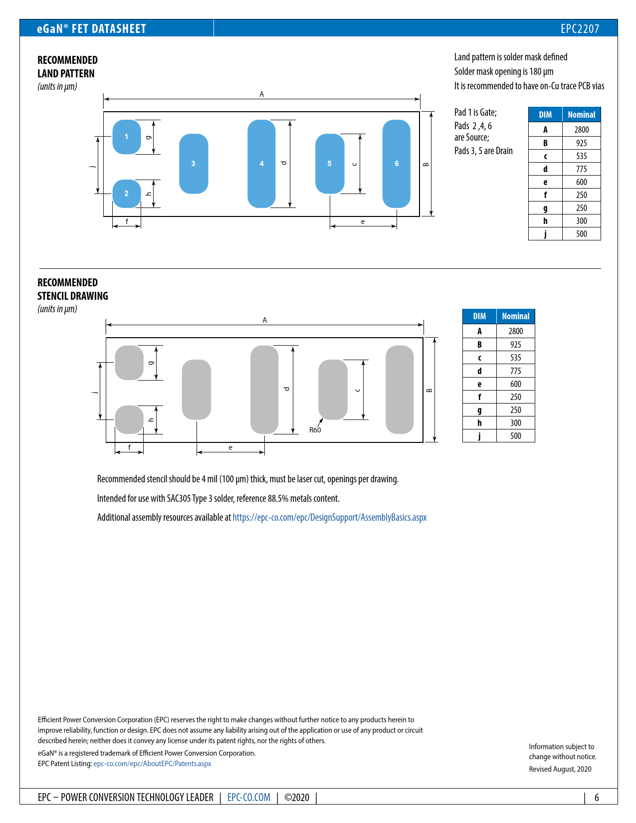 500 f e Recommended stencil should be 4 mil (100 µm) thick, must be laser cut, openings per drawing. Intended for use with SAC305 Type 3 solder, reference 88.5% metals content. Additional assembly resources available at https://epc-co.com/epc/DesignSupport/AssemblyBasics.aspx Efficient Power Conversion Corporation (EPC) reserves the right to make changes without further notice to any products herein to improve reliability, function or design. EPC does not assume any liability arising out of the application or use of any product or circuit described herein; neither does it convey any license under its patent rights, nor the rights of others. Information subject to eGaN® is a registered trademark of Efficient Power Conversion Corporation. change without notice. EPC Patent Listing: epc-co.com/epc/AboutEPC/Patents.aspx Revised August, 2020 EPC – POWER CONVERSION TECHNOLOGY LEADER | EPC-CO.COM | ©2020 | | 6