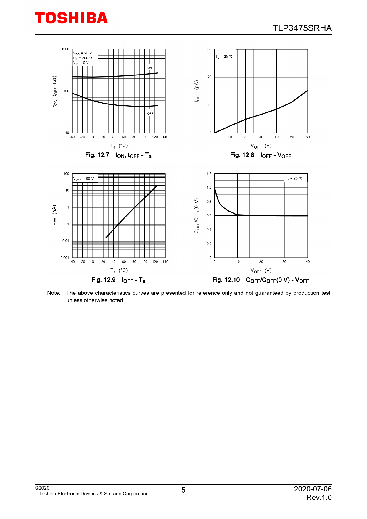 TLP3475SRHA. Fig. 12.7. tON,. tOFF. -. Ta. Fig. 12.8. IOFF. -. VOFF. Fig. 12.9. IOFF. -. Ta. Fig. 12.10. COFF/COFF(0. V). -. VOFF. Note:. The. above. characteristics. curves