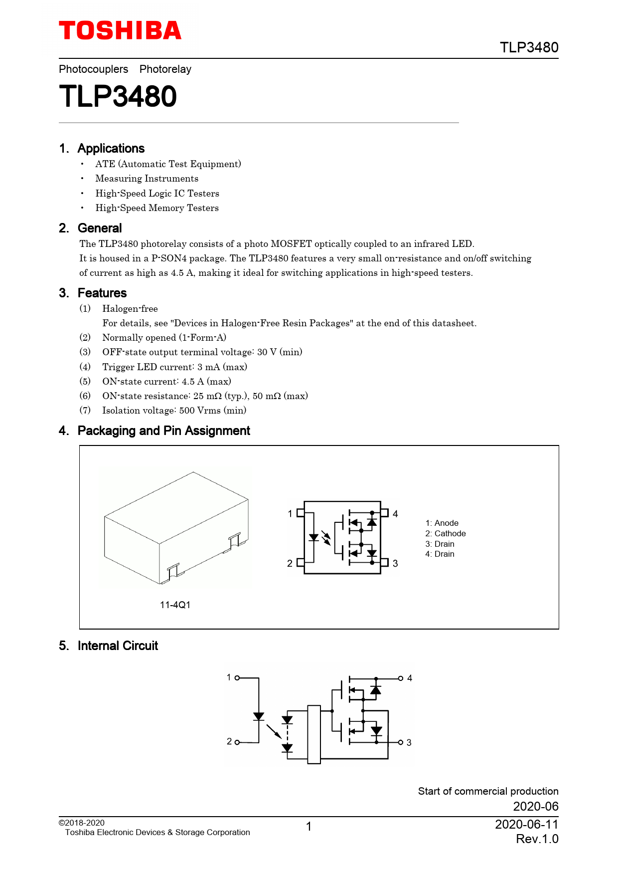 TLP3480 Photocouplers Photorelay TLP3480 1. Applications • ATE (Automatic Test Equipment) • Measuring Instruments • High-Speed Logic IC Testers • High-Speed Memory Testers 2. General The TLP3480 photorelay consists of a photo MOSFET optically coupled to an infrared LED. It is housed in a P-SON4 package. The TLP3480 features a very small on-resistance and on/off switching of current as high as 4.5 A, making it ideal for switching applications in high-speed testers. 3. Features (1) Halogen-free For details, see "Devices in Halogen-Free Resin Packages" at the end of this datasheet. (2) Normally opened (1-Form-A) (3) OFF-state output terminal voltage: 30 V (min) (4) Trigger LED current: 3 mA (max) (5) ON-state current: 4.5 A (max) (6) ON-state resistance: 25 mΩ (typ.), 50 mΩ (max) (7) Isolation voltage: 500 Vrms (min) 4. Packaging and Pin Assignment 1: Anode 2: Cathode 3: Drain 4: Drain 11-4Q1 5. Internal Circuit Start of commercial production 2020-06 ©2018-2020 1 2020-06-11 Toshiba Electronic Devices & Storage Corporation Rev.1.0