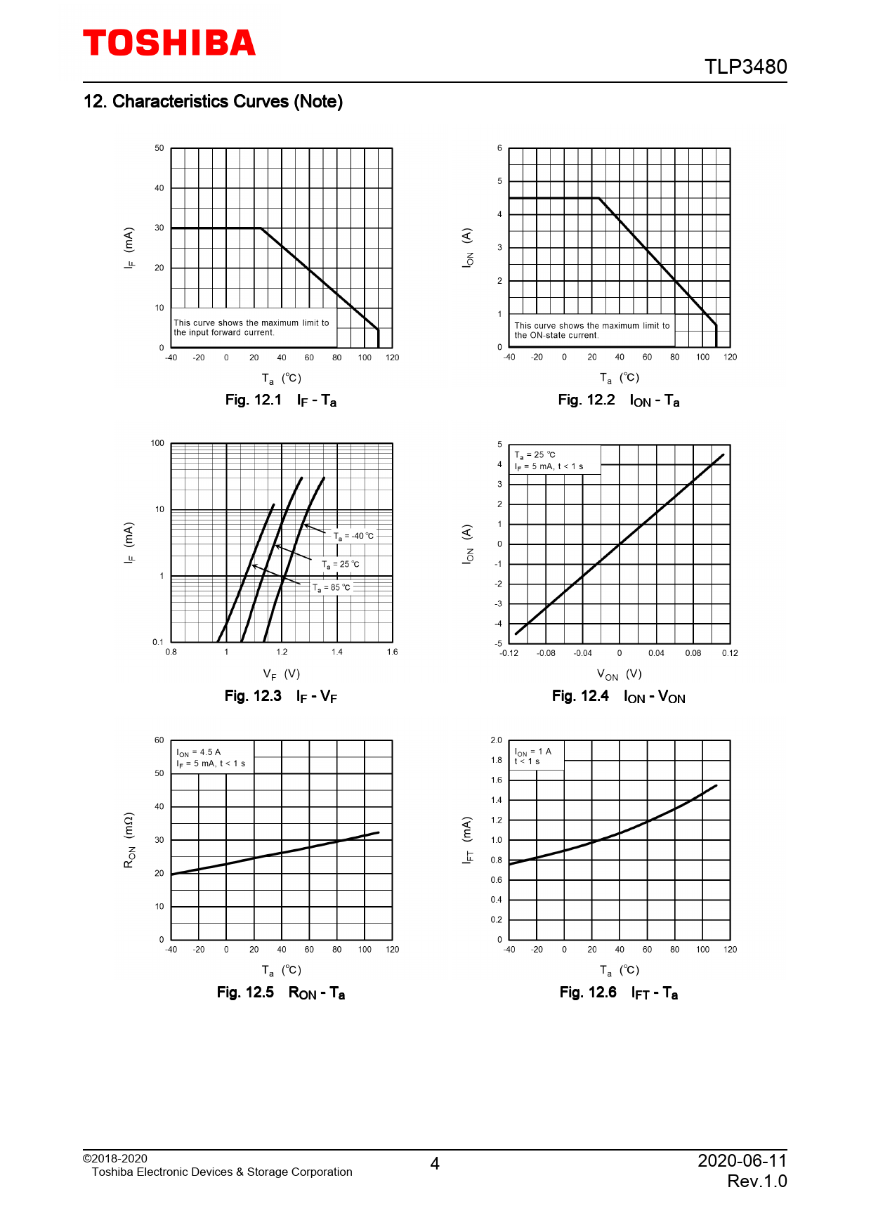 TLP3480 12. Characteristics Curves (Note) Fig. 12.1 IF - Ta Fig. 12.2 ION - Ta Fig. 12.3 IF - VF Fig. 12.4 ION - VON Fig. 12.5 RON - Ta Fig. 12.6 IFT - Ta ©2018-2020 4 2020-06-11 Toshiba Electronic Devices & Storage Corporation Rev.1.0