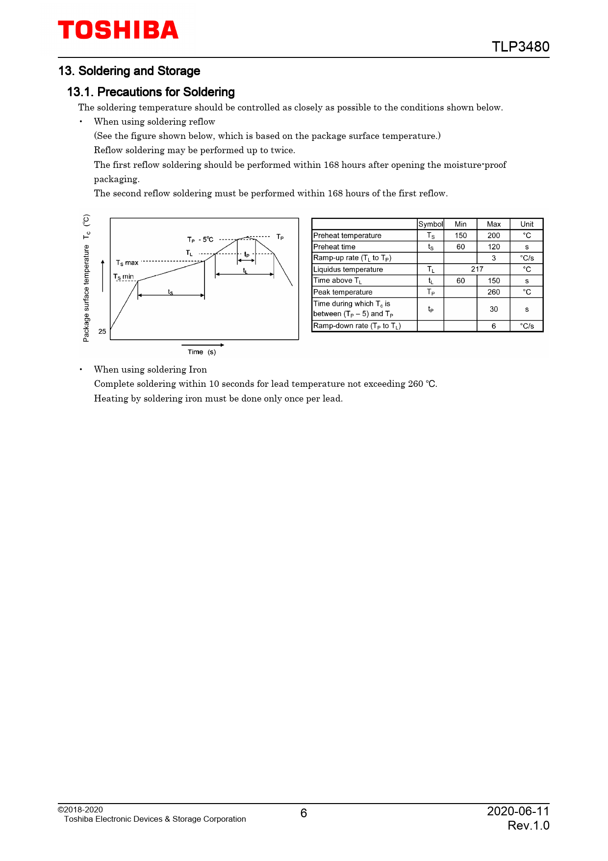 TLP3480 13. Soldering and Storage 13.1. Precautions for Soldering The soldering temperature should be controlled as closely as possible to the conditions shown below. • When using soldering reflow (See the figure shown below, which is based on the package surface temperature.) Reflow soldering may be performed up to twice. The first reflow soldering should be performed within 168 hours after opening the moisture-proof packaging. The second reflow soldering must be performed within 168 hours of the first reflow. • When using soldering Iron Complete soldering within 10 seconds for lead temperature not exceeding 260 . Heating by soldering iron must be done only once per lead. ©2018-2020 6 2020-06-11 Toshiba Electronic Devices & Storage Corporation Rev.1.0