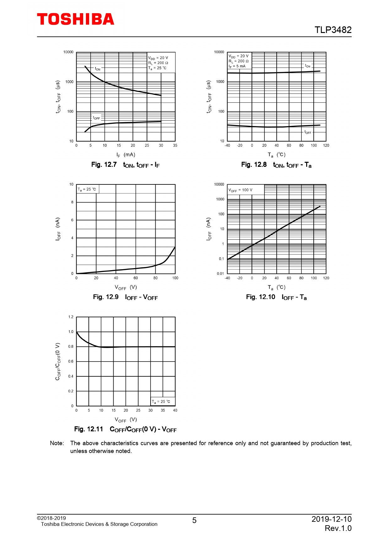 TLP3482. Fig. 12.7. tON,. tOFF. -. IF. Fig. 12.8. tON,. tOFF. -. Ta. Fig. 12.9. IOFF. -. VOFF. Fig. 12.10. IOFF. -. Ta. Fig. 12.11. COFF/COFF(0. V). -. VOFF. Note:. The. above
