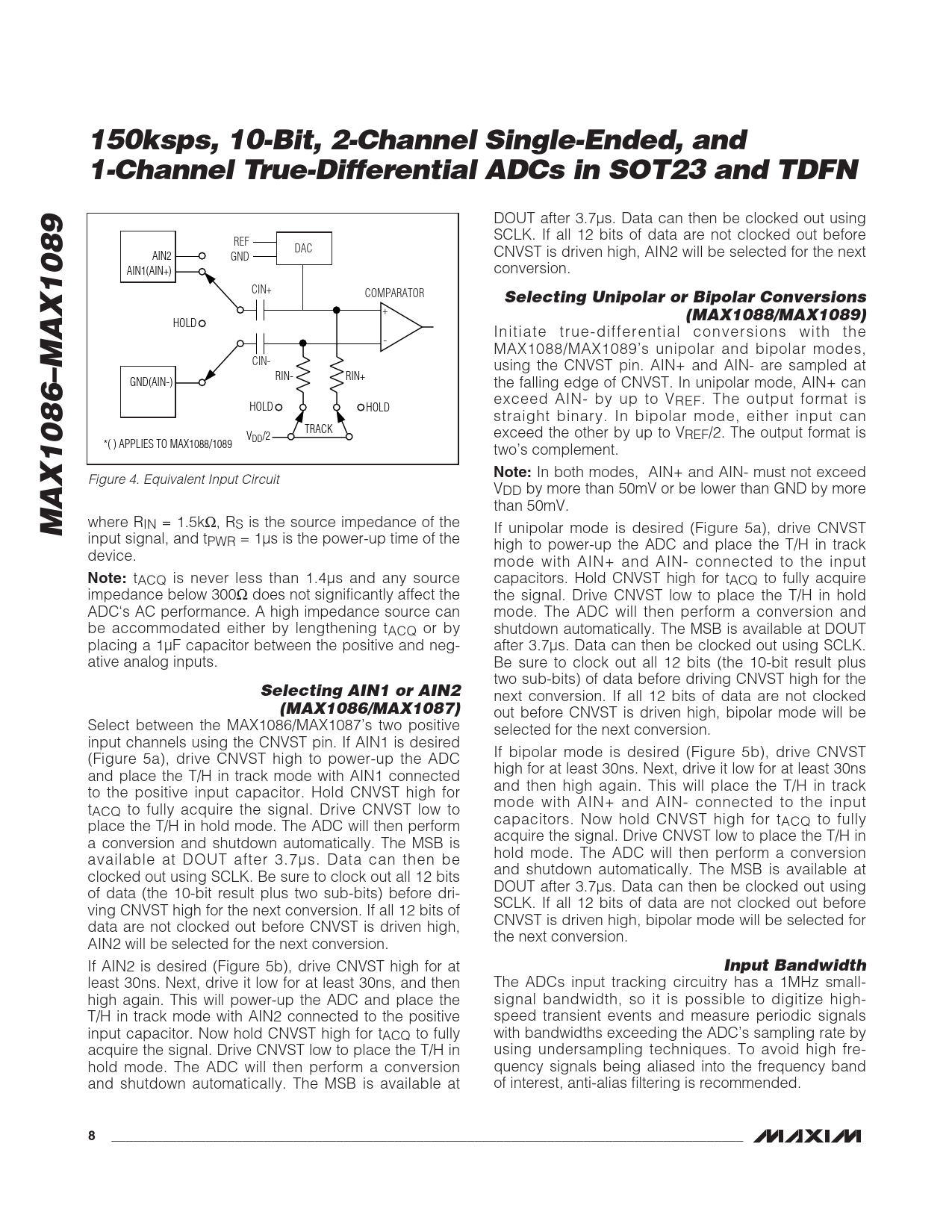 least 30ns. Next, drive it low for at least 30ns, and then The ADCs input tracking circuitry has a 1MHz small- high again. This will power-up the ADC and place the signal bandwidth, so it is possible to digitize high- T/H in track mode with AIN2 connected to the positive speed transient events and measure periodic signals input capacitor. Now hold CNVST high for tACQ to fully with bandwidths exceeding the ADC’s sampling rate by acquire the signal. Drive CNVST low to place the T/H in using undersampling techniques. To avoid high fre- hold mode. The ADC will then perform a conversion quency signals being aliased into the frequency band and shutdown automatically. The MSB is available at of interest, anti-alias filtering is recommended.