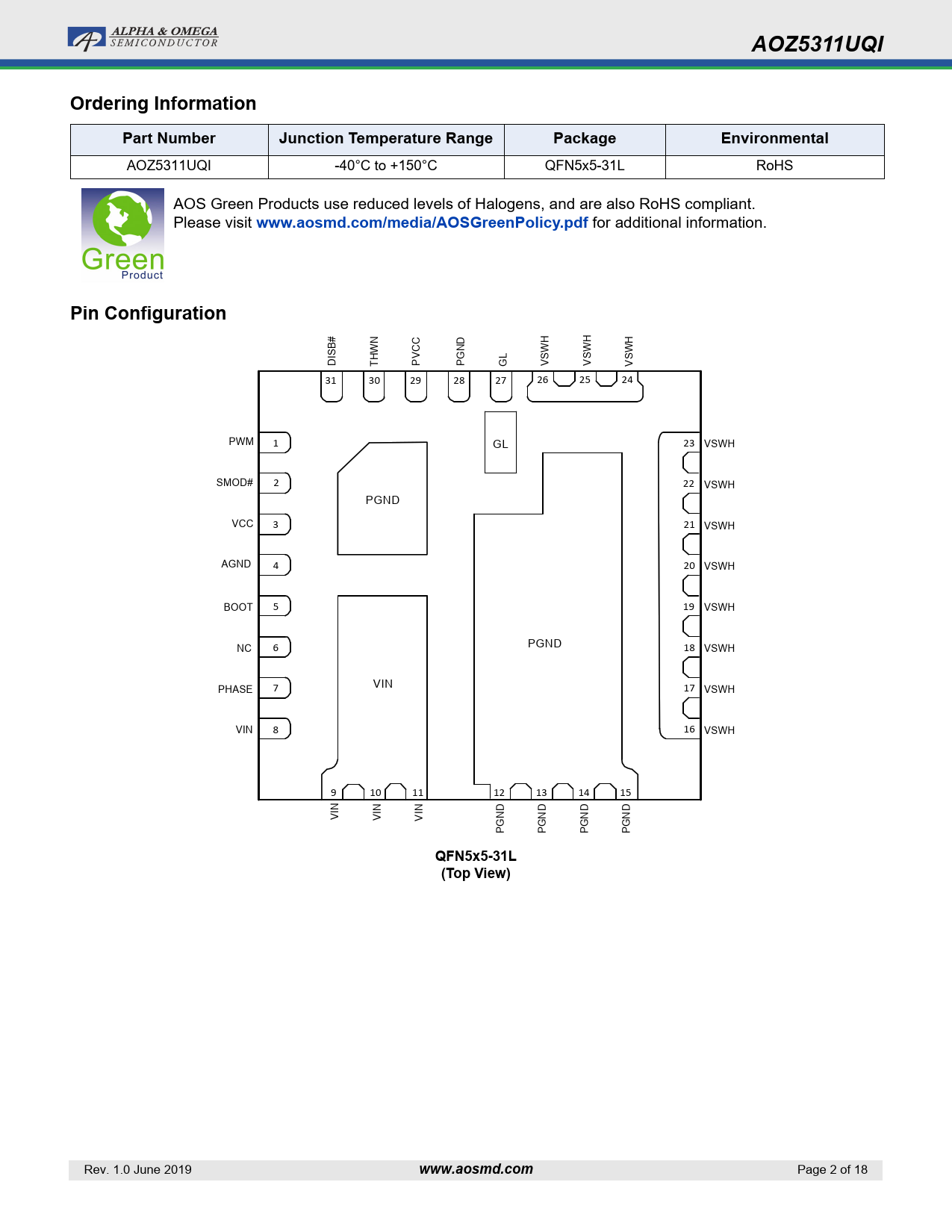 AOZ5311UQI -40°C to +150°C QFN5x5-31L RoHS AOS Green Products use reduced levels of Halogens, and are also RoHS compliant. Please visit