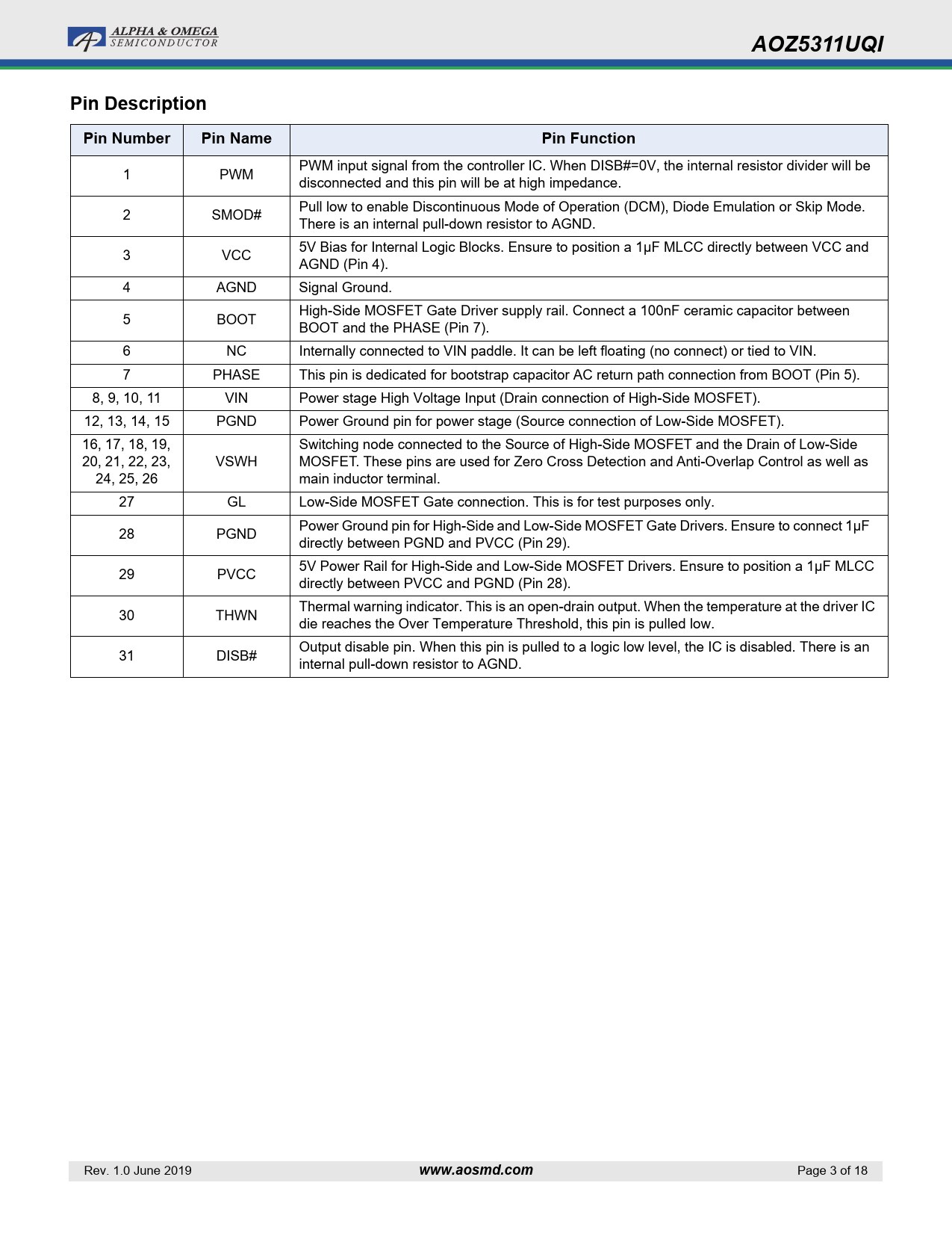 AOZ5311UQIPin DescriptionPin NumberPin NamePin Function 1 PWM PWM input signal from the controller IC. When DISB#=0V, the internal resistor divider will be disconnected and this pin will be at high impedance. 2 SMOD# Pull low to enable Discontinuous Mode of Operation (DCM), Diode Emulation or Skip Mode. There is an internal pull-down resistor to AGND. 3 VCC 5V Bias for Internal Logic Blocks. Ensure to position a 1µF MLCC directly between VCC and AGND (Pin 4). 4 AGND Signal Ground. 5 BOOT High-Side MOSFET Gate Driver supply rail. Connect a 100nF ceramic capacitor between BOOT and the PHASE (Pin 7). 6 NC Internally connected to VIN paddle. It can be left floating (no connect) or tied to VIN. 7 PHASE This pin is dedicated for bootstrap capacitor AC return path connection from BOOT (Pin 5). 8, 9, 10, 11 VIN Power stage High Voltage Input (Drain connection of High-Side MOSFET). 12, 13, 14, 15 PGND Power Ground pin for power stage (Source connection of Low-Side MOSFET). 16, 17, 18, 19, Switching node connected to the Source of High-Side MOSFET and the Drain of Low-Side 20, 21, 22, 23, VSWH MOSFET. These pins are used for Zero Cross Detection and Anti-Overlap Control as well as 24, 25, 26 main inductor terminal. 27 GL Low-Side MOSFET Gate connection. This is for test purposes only. 28 PGND Power Ground pin for High-Side and Low-Side MOSFET Gate Drivers. Ensure to connect 1µF directly between PGND and PVCC (Pin 29). 29 PVCC 5V Power Rail for High-Side and Low-Side MOSFET Drivers. Ensure to position a 1µF MLCC directly between PVCC and PGND (Pin 28). 30 THWN Thermal warning indicator. This is an open-drain output. When the temperature at the driver IC die reaches the Over Temperature Threshold, this pin is pulled low. 31 DISB# Output disable pin. When this pin is pulled to a logic low level, the IC is disabled. There is an internal pull-down resistor to AGND. Rev. 1.0 June 2019 www.aosmd.com Page 3 of 18