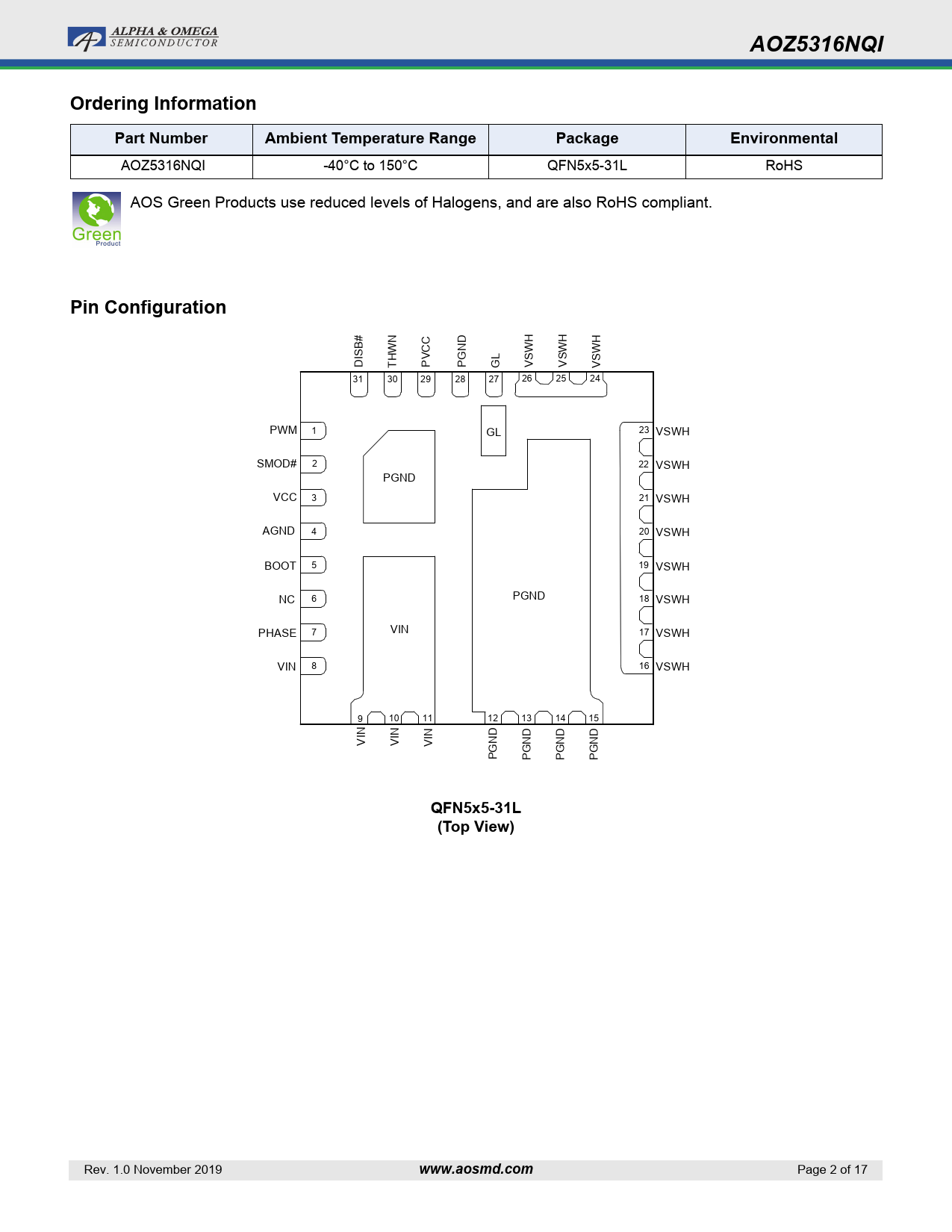 AOZ5316NQI. Ordering Information. Part Number. Ambient Temperature Range. Package. Environmental. Pin Configuration. QFN5x5-31L
