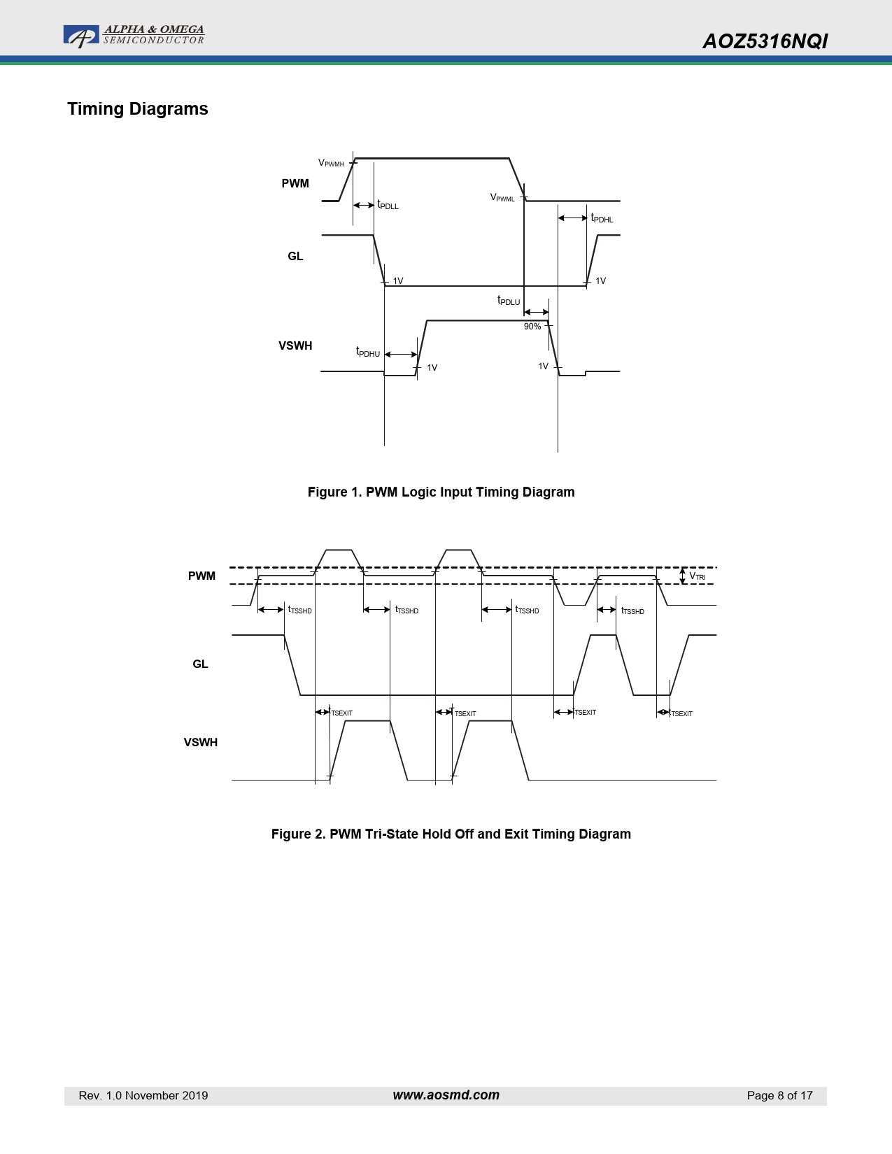 | Páginas / Página | 17 / 8 — AOZ5316NQI. Timing Diagrams. PWM. VSWH. Figure 1. PWM Logic Input Timing … |