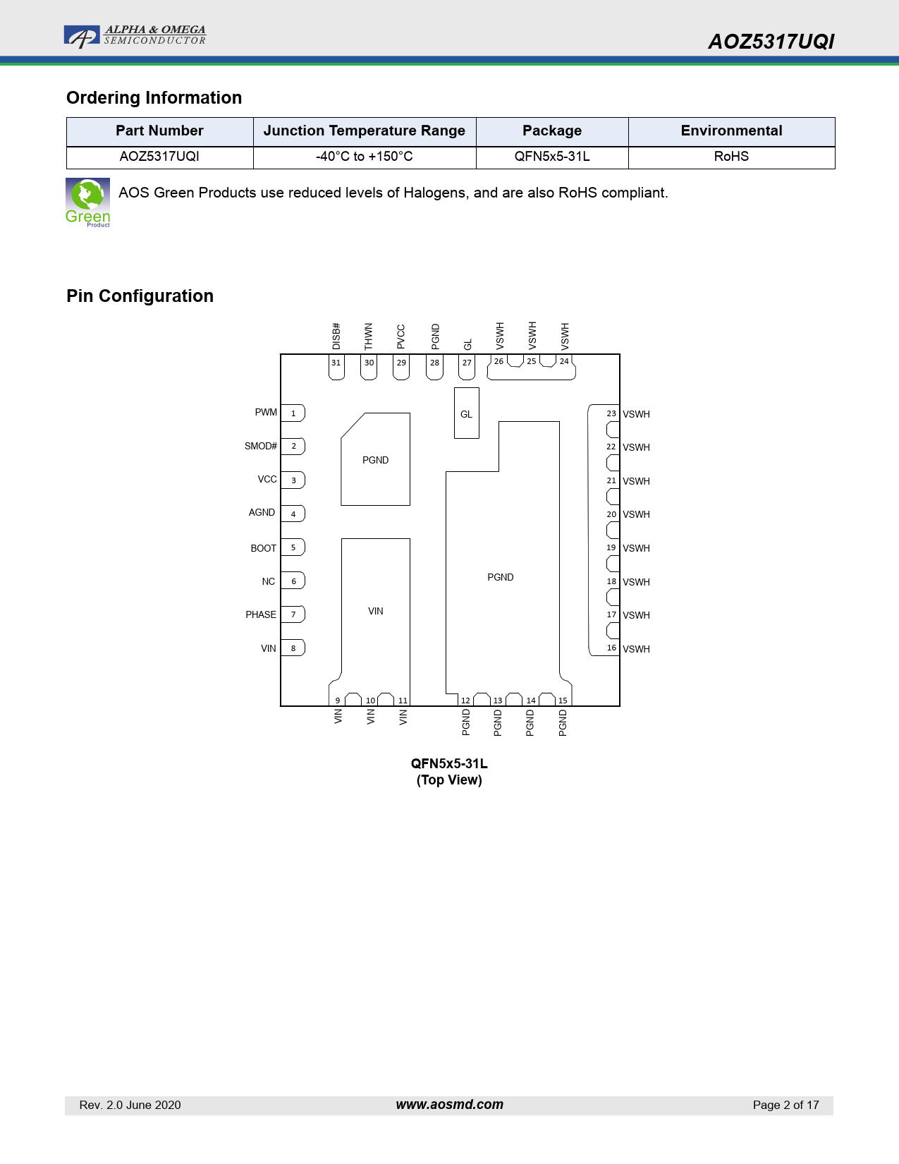 AOZ5317UQI Ordering Information Part Number Junction Temperature Range Package Environmental Pin Configuration QFN5x5-31L