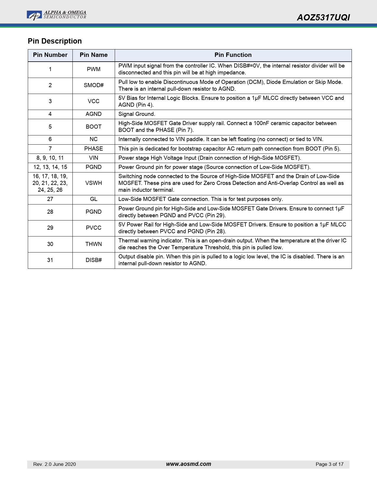 Páginas / Página17 / 3 — AOZ5317UQI. Pin Description. Pin Number. Pin Name. Pin Function. …