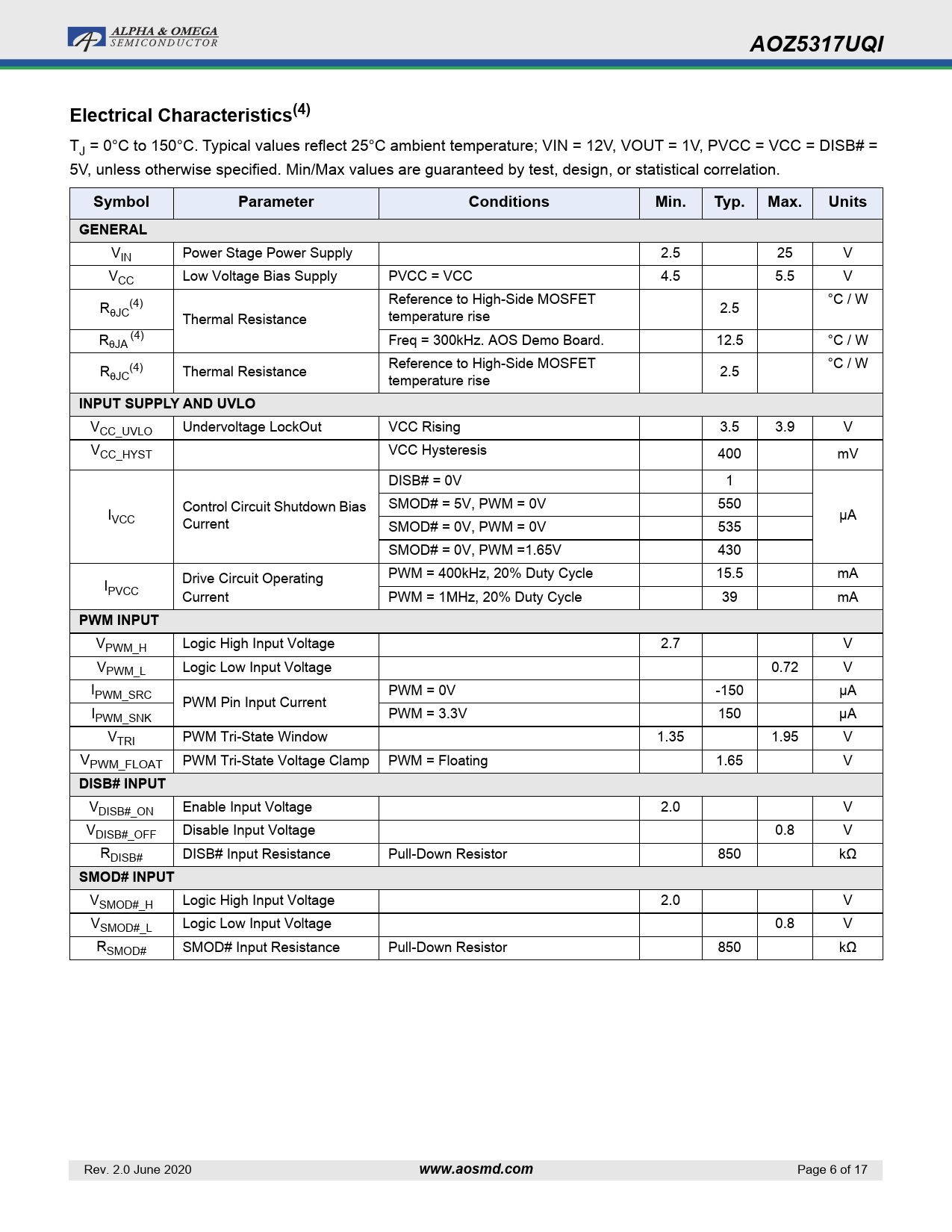AOZ5317UQI. Electrical Characteristics(4). Symbol. Parameter. Conditions. Min. Typ. Max. Units. GENERAL. INPUT SUPPLY AND UVLO. PWM INPUT