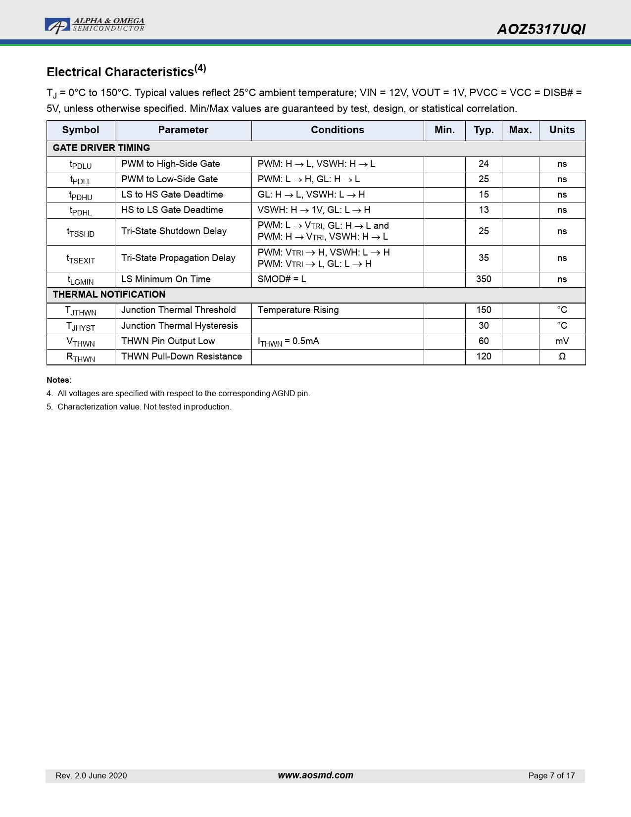AOZ5317UQI. Electrical Characteristics(4). Symbol. Parameter. Conditions. Min. Typ. Max. Units. GATE DRIVER TIMING. THERMAL NOTIFICATION