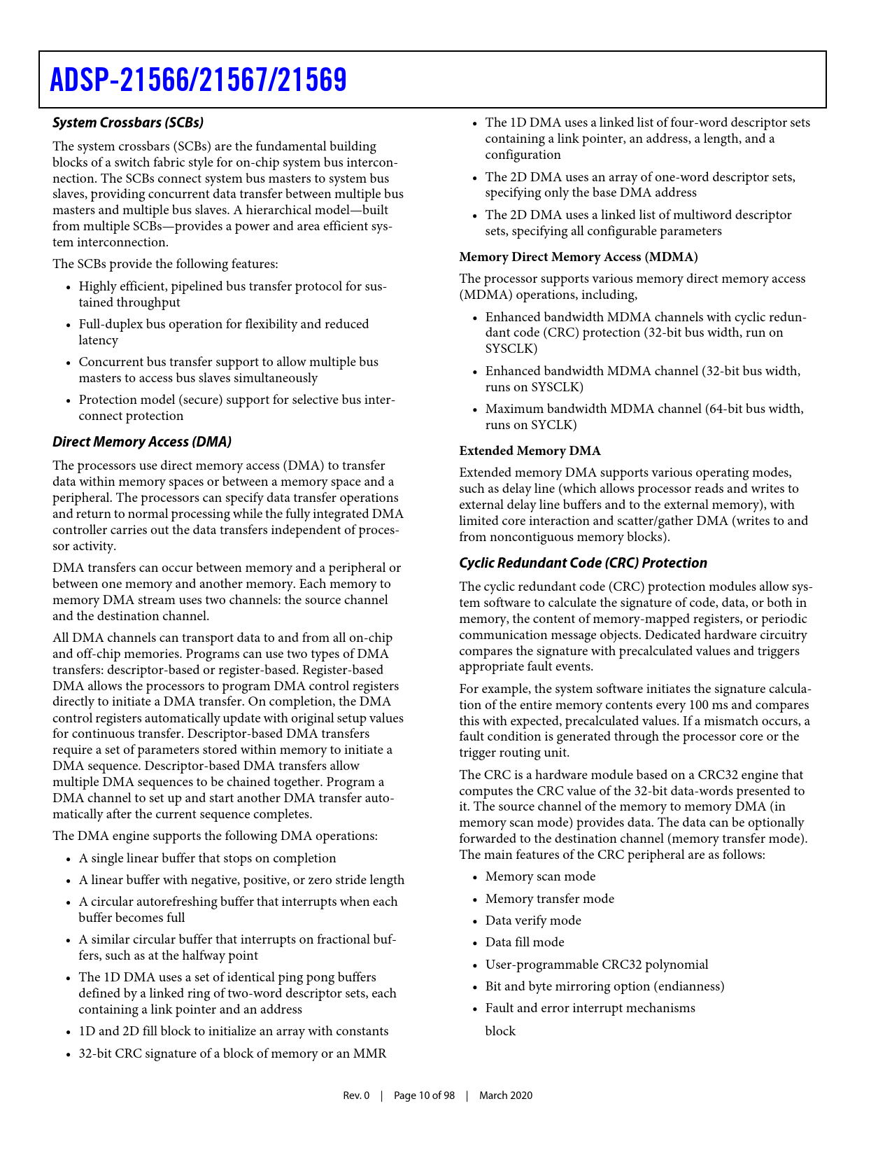 ADSP-21566/21567/21569System Crossbars (SCBs) • The 1D DMA uses a linked list of four-word descriptor sets containing a link pointer, an address, a length, and a The system crossbars (SCBs) are the fundamental building configuration blocks of a switch fabric style for on-chip system bus intercon- nection. The SCBs connect system bus masters to system bus • The 2D DMA uses an array of one-word descriptor sets, slaves, providing concurrent data transfer between multiple bus specifying only the base DMA address masters and multiple bus slaves. A hierarchical model—built • The 2D DMA uses a linked list of multiword descriptor from multiple SCBs—provides a power and area efficient sys- sets, specifying all configurable parameters tem interconnection. Memory Direct Memory Access (MDMA) The SCBs provide the following features: The processor supports various memory direct memory access • Highly efficient, pipelined bus transfer protocol for sus- (MDMA) operations, including, tained throughput • Enhanced bandwidth MDMA channels with cyclic redun- • Full-duplex bus operation for flexibility and reduced dant code (CRC) protection (32-bit bus width, run on latency SYSCLK) • Concurrent bus transfer support to allow multiple bus • Enhanced bandwidth MDMA channel (32-bit bus width, masters to access bus slaves simultaneously runs on SYSCLK) • Protection model (secure) support for selective bus inter- • Maximum bandwidth MDMA channel (64-bit bus width, connect protection runs on SYCLK) Direct Memory Access (DMA)Extended Memory DMA The processors use direct memory access (DMA) to transfer Extended memory DMA supports various operating modes, data within memory spaces or between a memory space and a such as delay line (which allows processor reads and writes to peripheral. The processors can specify data transfer operations external delay line buffers and to the external memory), with and return to normal processing while the fully integrated DMA limited core interaction and scatter/gather DMA (writes to and controller carries out the data transfers independent of proces- from noncontiguous memory blocks). sor activity. DMA transfers can occur between memory and a peripheral or Cyclic Redundant Code (CRC) Protection between one memory and another memory. Each memory to The cyclic redundant code (CRC) protection modules allow sys- memory DMA stream uses two channels: the source channel tem software to calculate the signature of code, data, or both in and the destination channel. memory, the content of memory-mapped registers, or periodic All DMA channels can transport data to and from all on-chip communication message objects. Dedicated hardware circuitry and off-chip memories. Programs can use two types of DMA compares the signature with precalculated values and triggers transfers: descriptor-based or register-based. Register-based appropriate fault events. DMA allows the processors to program DMA control registers For example, the system software initiates the signature calcula- directly to initiate a DMA transfer. On completion, the DMA tion of the entire memory contents every 100 ms and compares control registers automatically update with original setup values this with expected, precalculated values. If a mismatch occurs, a for continuous transfer. Descriptor-based DMA transfers fault condition is generated through the processor core or the require a set of parameters stored within memory to initiate a trigger routing unit. DMA sequence. Descriptor-based DMA transfers allow The CRC is a hardware module based on a CRC32 engine that multiple DMA sequences to be chained together. Program a computes the CRC value of the 32-bit data-words presented to DMA channel to set up and start another DMA transfer auto- it. The source channel of the memory to memory DMA (in matically after the current sequence completes. memory scan mode) provides data. The data can be optionally The DMA engine supports the following DMA operations: forwarded to the destination channel (memory transfer mode). • A single linear buffer that stops on completion The main features of the CRC peripheral are as follows: • A linear buffer with negative, positive, or zero stride length • Memory scan mode • A circular autorefreshing buffer that interrupts when each • Memory transfer mode buffer becomes full • Data verify mode • A similar circular buffer that interrupts on fractional buf- • Data fill mode fers, such as at the halfway point • User-programmable CRC32 polynomial • The 1D DMA uses a set of identical ping pong buffers • Bit and byte mirroring option (endianness) defined by a linked ring of two-word descriptor sets, each containing a link pointer and an address • Fault and error interrupt mechanisms • 1D and 2D fill block to initialize an array with constants block • 32-bit CRC signature of a block of memory or an MMR Rev. 0 | Page 10 of 98 | March 2020 Document Outline System Features Memory Additional Features Applications Table of Contents Revision History General Description SHARC Processor L1 Memory L1 Master and Slave Ports L1 On-Chip Memory Bandwidth Instruction and Data Cache Core Memory-Mapped Registers (CMMR) SHARC+ Core Architecture Single-Instruction, Multiple Data (SIMD) Computational Engine Independent Parallel Computation Units Core Timer Data Register File Context Switch Universal Registers Data Address Generators (DAG) With Zero Overhead Hardware Circular Buffer Support Flexible Instruction Set Architecture (ISA) Variable Instruction Set Architecture (VISA) Single-Cycle Fetch of Instructional Four Operands Core Event Controller (CEC) Instruction Conflict Cache Branch Target Buffer (BTB)/Branch Predictor (BP) Addressing Spaces Additional Features System Infrastructure System L2 Memory One Time Programmable Memory (OTP) I/O Memory Space System Memory Map System Crossbars (SCBs) Direct Memory Access (DMA) Memory Direct Memory Access (MDMA) Extended Memory DMA Cyclic Re