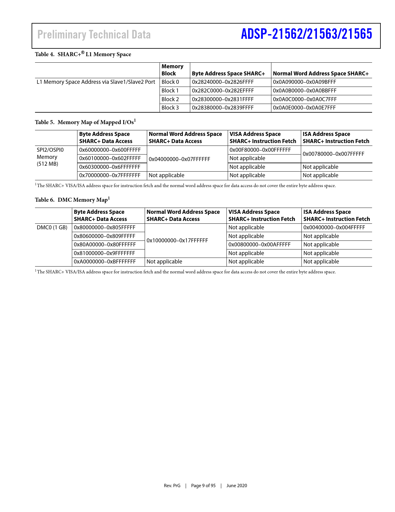 Preliminary Technical Data ADSP-21562/21563/21565 Table 4. SHARC+® L1 Memory Space Memory Block Byte Address Space SHARC+ Normal Word Address Space SHARC+
