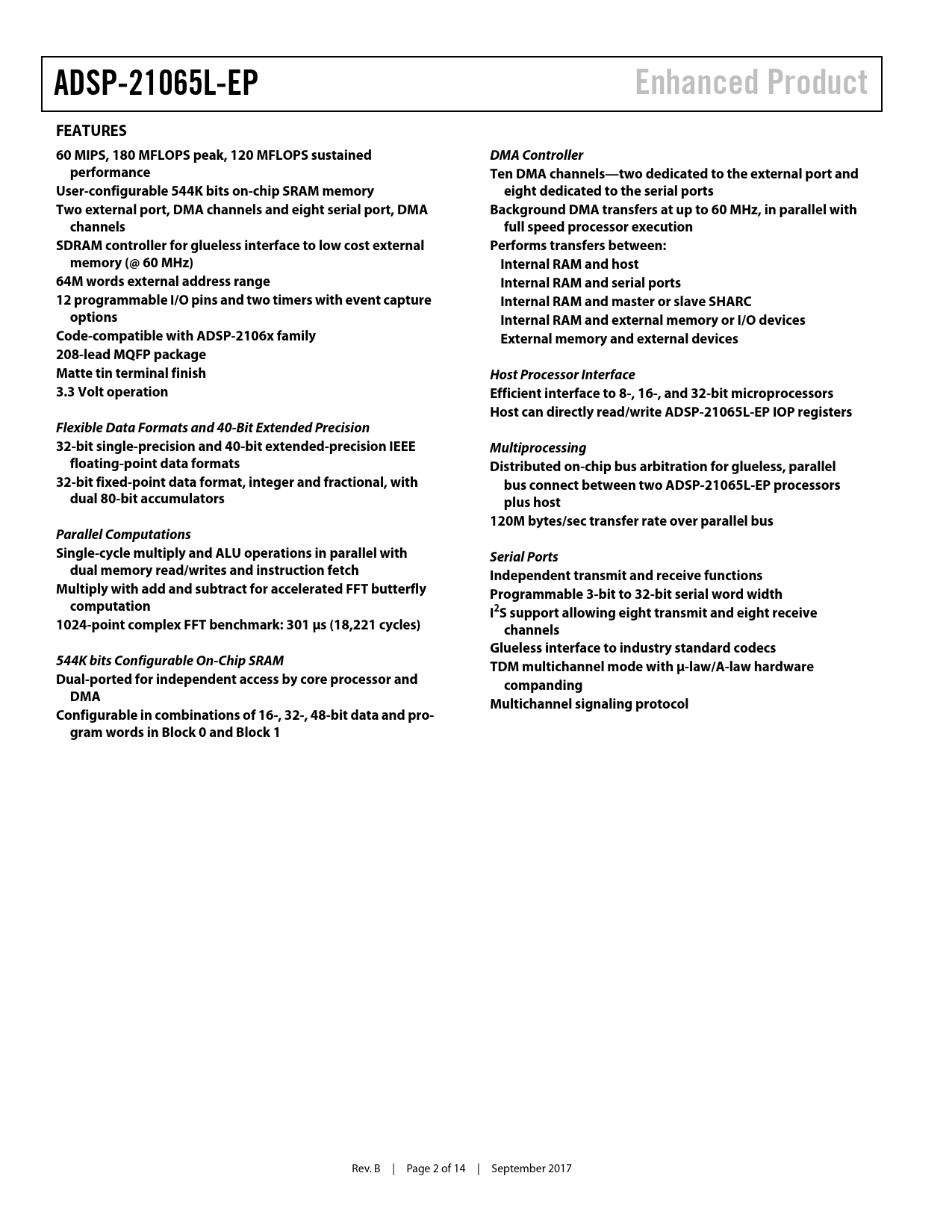 ADSP-21065L-EPEnhanced ProductFEATURES60 MIPS, 180 MFLOPS peak, 120 MFLOPS sustainedDMA ControllerperformanceTen DMA channels—two dedicated to the external port andUser-configurable 544K bits on-chip SRAM memoryeight dedicated to the serial portsTwo external port, DMA channels and eight serial port, DMABackground DMA transfers at up to 60 MHz, in parallel withchannelsfull speed processor executionSDRAM controller for glueless interface to low cost externalPerforms transfers between:memory (@ 60 MHz)Internal RAM and host64M words external address rangeInternal RAM and serial ports12 programmable I/O pins and two timers with event captureInternal RAM and master or slave SHARCoptionsInternal RAM and external memory or I/O devicesCode-compatible with ADSP-2106x familyExternal memory and external devices208-lead MQFP package Matte tin terminal finishHost Processor Interface3.3 Volt operationEfficient interface to 8-, 16-, and 32-bit microprocessors Host can directly read/write ADSP-21065L-EP IOP registersFlexible Data Formats and 40-Bit Extended Precision32-bit single-precision and 40-bit extended-precision IEEEMultiprocessingfloating-point data formatsDistributed on-chip bus arbitration for glueless, parallel32-bit fixed-point data format, integer and fractional, withbus connect between two ADSP-21065L-EP processorsdual 80-bit accumulatorsplus host120M bytes/sec transfer rate over parallel busParallel ComputationsSingle-cycle multiply and ALU operations in parallel withSerial Portsdual memory read/writes and instruction fetchIndependent transmit and receive functionsMultiply with add and subtract for accelerated FFT butterflyProgrammable 3-bit to 32-bit serial word widthcomputationI2S support allowing eight transmit and eight receive1024-point complex FFT benchmark: 301 μs (18,221 cycles)channelsGlueless interface to industry standard codecs544K bits Configurable On-Chip SRAMTDM multichannel mode with μ-law/A-law hardwareDual-ported for independent access by core processor andcompandingDMAMultichannel signaling protocolConfigurable in combinations of 16-, 32-, 48-bit data and pro-gram words in Block 0 and Block 1 Rev. B | Page 2 of 14 | September 2017 Document Outline Summary Enhanced Product (EP) Features Features Table of Contents Revision History General Description Pin Function Descriptions Specifications Operating Conditions Absolute Maximum Ratings ESD Caution Package Marking Information Environmental Conditions Thermal Characteristics 208-LEAD MQFP Pin Configuration Outline Dimensions Ordering Guide