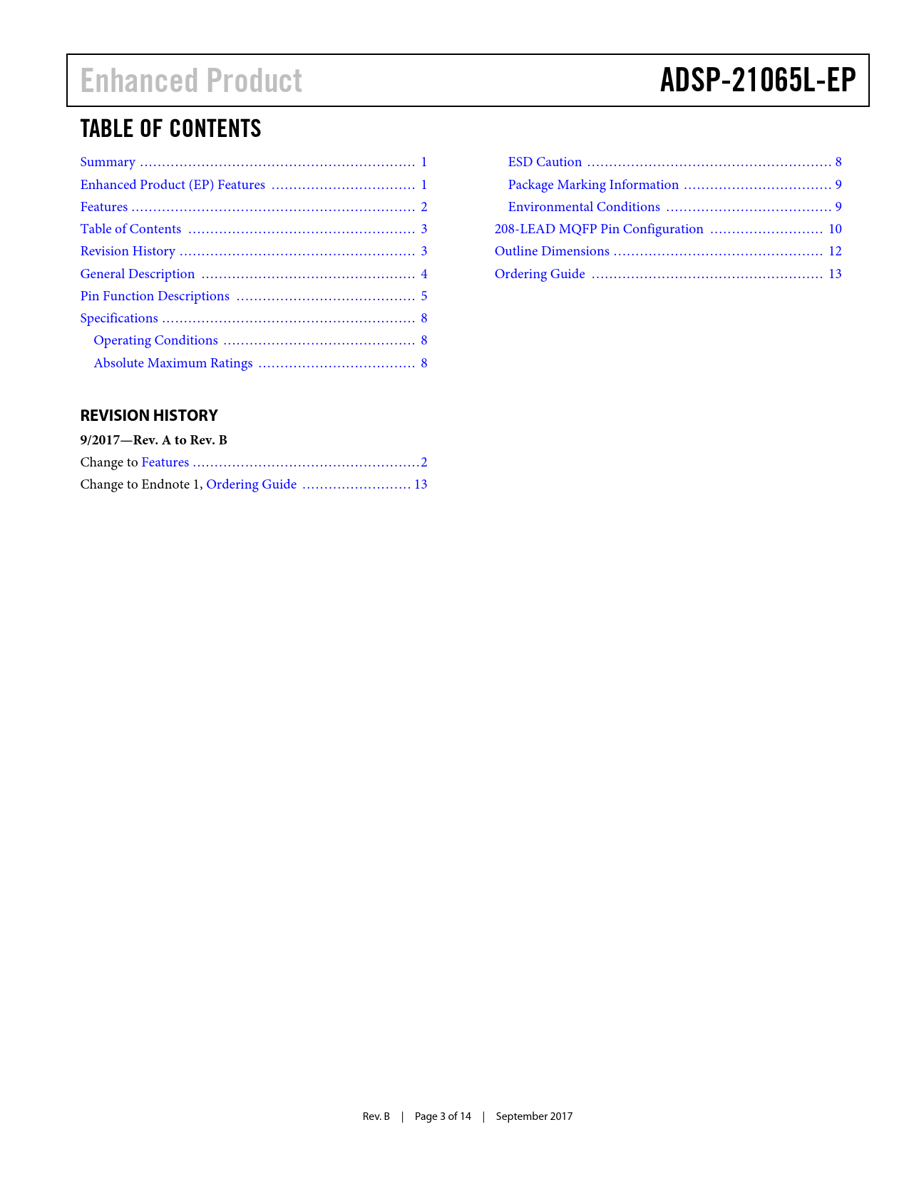 Páginas / Página14 / 3 — Enhanced Product. ADSP-21065L-EP. TABLE OF CONTENTS. REVISION HISTORY. …