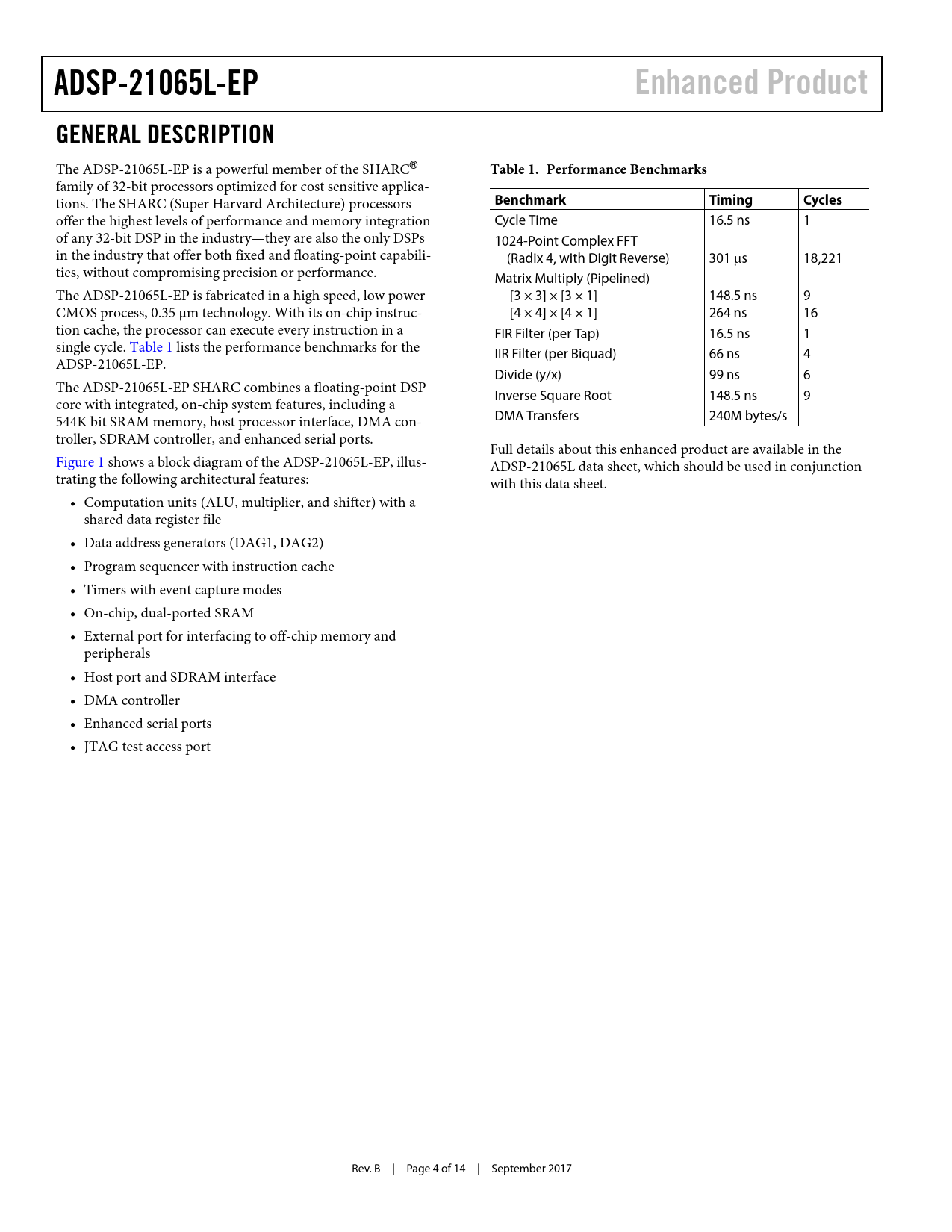 link to page 4 link to page 1 ADSP-21065L-EPEnhanced ProductGENERAL DESCRIPTION The ADSP-21065L-EP is a powerful member of the SHARC® Table 1. Performance Benchmarks family of 32-bit processors optimized for cost sensitive applica- tions. The SHARC (Super Harvard Architecture) processors BenchmarkTimingCycles offer the highest levels of performance and memory integration Cycle Time 16.5 ns 1 of any 32-bit DSP in the industry—they are also the only DSPs 1024-Point Complex FFT in the industry that offer both fixed and floating-point capabili- (Radix 4, with Digit Reverse) 301 s 18,221 ties, without compromising precision or performance. Matrix Multiply (Pipelined) The ADSP-21065L-EP is fabricated in a high speed, low power [3 × 3] × [3 × 1] 148.5 ns 9 CMOS process, 0.35 μm technology. With its on-chip instruc- [4 × 4] × [4 × 1] 264 ns 16 tion cache, the processor can execute every instruction in a FIR Filter (per Tap) 16.5 ns 1 single cycle. Table 1 lists the performance benchmarks for the IIR Filter (per Biquad) 66 ns 4 ADSP-21065L-EP. Divide (y/x) 99 ns 6 The ADSP-21065L-EP SHARC combines a floating-point DSP Inverse Square Root 148.5 ns 9 core with integrated, on-chip system features, including a 544K bit SRAM memory, host processor interface, DMA con- DMA Transfers 240M bytes/s troller, SDRAM controller, and enhanced serial ports. Full details about this enhanced product are available in the Figure 1 shows a block diagram of the ADSP-21065L-EP, illus- ADSP-21065L data sheet, which should be used in conjunction trating the following architectural features: with this data sheet. • Computation units (ALU, multiplier, and shifter) with a shared data register file • Data address generators (DAG1, DAG2) • Program sequencer with instruction cache • Timers with event capture modes • On-chip, dual-ported SRAM • External port for interfacing to off-chip memory and peripherals • Host port and SDRAM interface • DMA controller • Enhanced serial ports • JTAG test access port Rev. B | Page 4 of 14 | September 2017 Document Outline Summary Enhanced Product (EP) Features Features Table of Contents Revision History General Description Pin Function Descriptions Specifications Operating Conditions Absolute Maximum Ratings ESD Caution Package Marking Information Environmental Conditions Thermal Characteristics 208-LEAD MQFP Pin Configuration Outline Dimensions Ordering Guide