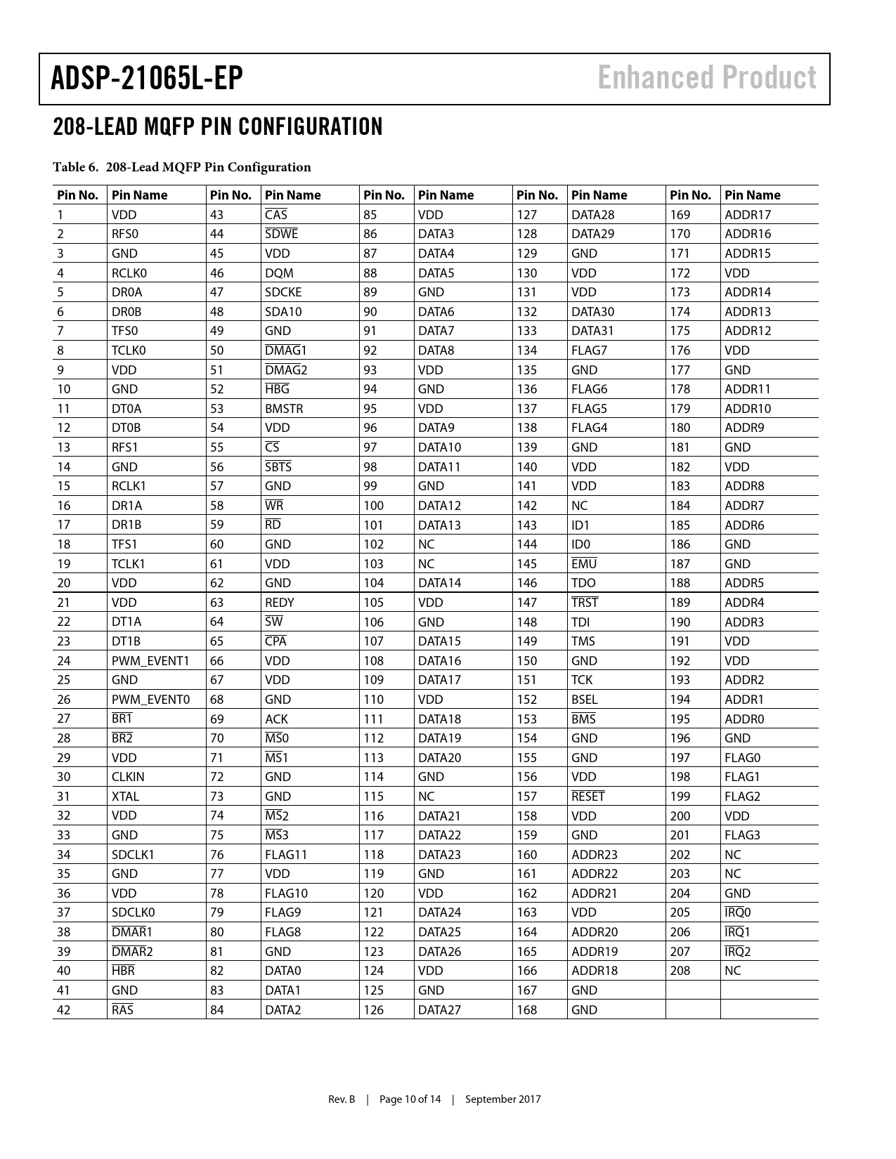 ADSP-21065L-EP. Enhanced Product. 208-LEAD MQFP PIN CONFIGURATION. Table 6. 208-Lead MQFP Pin Configuration. Pin No. Pin Name