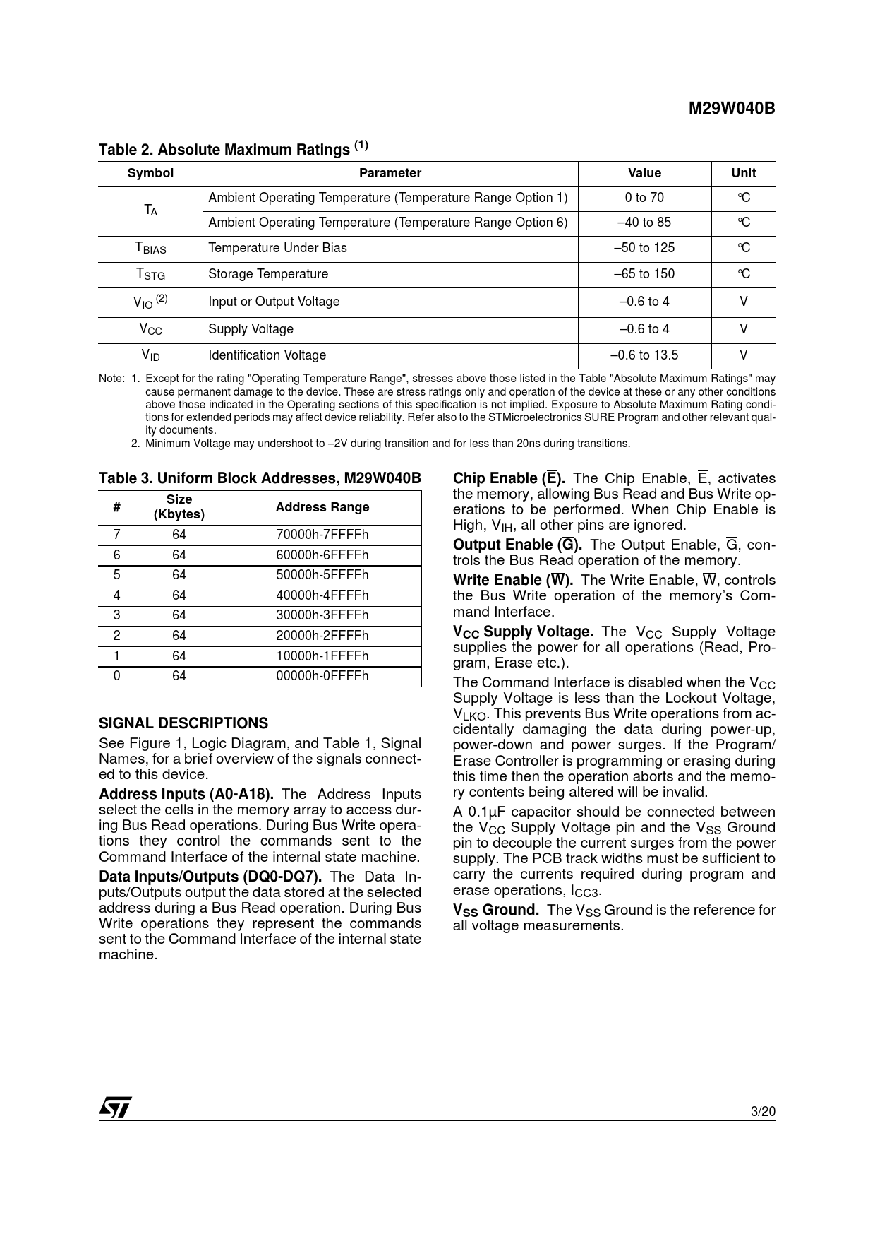 link to page 1 link to page 2 M29W040BTable 2. Absolute Maximum Ratings (1)SymbolParameterValueUnit Ambient Operating Temperature (Temperature Range Option 1) 0 to 70 °C TA Ambient Operating Temperature (Temperature Range Option 6) –40 to 85 °C TBIAS Temperature Under Bias –50 to 125 °C TSTG Storage Temperature –65 to 150 °C V (2) IO Input or Output Voltage –0.6 to 4 V VCC Supply Voltage –0.6 to 4 V VID Identification Voltage –0.6 to 13.5 V Note: 1. Except for the rating "Operating Temperature Range", stresses above those listed in the Table "Absolute Maximum Ratings" may cause permanent damage to the device. These are stress ratings only and operation of the device at these or any other conditions above those indicated in the Operating sections of this specification is not implied. Exposure to Absolute Maximum Rating condi- tions for extended periods may affect device reliability. Refer also to the STMicroelectronics SURE Program and other relevant qual- ity documents. 2. Minimum Voltage may undershoot to –2V during transition and for less than 20ns during transitions. Table 3. Uniform Block Addresses, M29W040BChip Enable (E). The Chip Enable, E, activates the memory, allowing Bus Read and Bus Write op- Size#Address Range erations to be performed. When Chip Enable is (Kbytes) High, VIH, all other pins are ignored. 7 64 70000h-7FFFFh Output Enable (G). The Output Enable, G, con- 6 64 60000h-6FFFFh trols the Bus Read operation of the memory. 5 64 50000h-5FFFFh Write Enable (W). The Write Enable, W, controls 4 64 40000h-4FFFFh the Bus Write operation of the memory’s Com- mand Interface. 3 64 30000h-3FFFFh V 2 64 20000h-2FFFFh CC Supply Voltage. The VCC Supply Voltage supplies the power for all operations (Read, Pro- 1 64 10000h-1FFFFh gram, Erase etc.). 0 64 00000h-0FFFFh The Command Interface is disabled when the VCC Supply Voltage is less than the Lockout Voltage, V SIGNAL DESCRIPTIONS LKO. This prevents Bus Write operations from ac- cidentally damaging the data during power-up, See Figure 1, Logic Diagram, and Table 1, Signal power-down and power surges. If the Program/ Names, for a brief overview of the signals connect- Erase Controller is programming or erasing during ed to this device. this time then the operation aborts and the memo- Address Inputs (A0-A18). The Address Inputs ry contents being altered will be invalid. select the cells in the memory array to access dur- A 0.1µF capacitor should be connected between ing Bus Read operations. During Bus Write opera- the VCC Supply Voltage pin and the VSS Ground tions they control the commands sent to the pin to decouple the current surges from the power Command Interface of the internal state machine. supply. The PCB track widths must be sufficient to Data Inputs/Outputs (DQ0-DQ7). The Data In- carry the currents required during program and puts/Outputs output the data stored at the selected erase operations, ICC3. address during a Bus Read operation. During Bus VSS Ground. The VSS Ground is the reference for Write operations they represent the commands all voltage measurements. sent to the Command Interface of the internal state machine. 3/20 Document Outline Table 1. Signal Names Table 2. Absolute Maximum Ratings (1) Table 3. Uniform Block Addresses, M29W040B Table 4. Bus Operations Table 5. Commands Read/Reset. Auto Select. Program, Unlock Bypass Program, Chip Erase, Block Erase. Unlock Bypass. Unlock Bypass Reset. Erase Suspend. Erase Resume. Table 6. Program, Erase Times and Program, Erase Endurance Cycles (TA = 0 to 70˚C or –40 to 85˚C) Table 7. Status Register Bits Table 8. AC Measurement Conditions Table 9. Capacitance (TA = 25 ˚C, f = 1 MHz) Table 10. DC Characteristics (TA = 0 to 70˚C or –40 to 85˚C) Table 11. Read AC Characteristics (TA = 0 to 70˚C or –40 to 85˚C) Table 12. Write AC Characteristics, Write Enable Controlled (TA = 0 to 70˚C or –40 to 85˚C) Table 13. Write AC Characteristics, Chip Enable Controlled (TA = 0 to 70˚C or –40 to 85˚C) Table 14. Ordering Information Scheme Table 15. PLCC32 – 32 lead Plastic Leaded Chip Carrier, Package Mechanical Data Table 16. TSOP32 – 32 lead Plastic Thin Small Outline, 8 x 20mm, Package Mechanical Data Table 17. TSOP32 – 32 lead Plastic Thin Small Outline, 8 x 14mm, Package Mechanical Data Table 18. Revision History SUMMARY DESCRIPTION SIGNAL DESCRIPTIONS Address Inputs (A0-A18). Data Inputs/Outputs (DQ0-DQ7). Chip Enable (E). Output Enable (G). Write Enable (W). VCC Supply Voltage. VSS Ground. BUS OPERATIONS Bus Read. Bus Write. Output Disable. Standby. Automatic Standby. Special Bus Operations Electronic Signature. Block Protection and Blocks Unprotection. COMMAND INTERFACE Read/Reset Command. Auto Select Command. Program Command. Unlock Bypass Command. Unlock Bypass Program Command. Unlock Bypass Reset Command. Chip Erase Command. Block Erase Command. Erase Suspend Command. Erase Resume Command. STATUS REGISTER Data Polling Bit (DQ7). Toggle Bit (DQ6). Error Bit (DQ5). Erase Timer Bit (DQ3). Alternative Toggle Bit (DQ2). Figure 1. Logic Diagram Figure 2. PLCC Connections Figure 3. TSOP Connections Figure 4. Data Polling Flowchart Figure 5. Data Toggle Flowchart Figure 6. AC Testing Input Output Waveform Figure 7. AC Testing Load Circuit Figure 8. Read Mode AC Waveforms Figure 9. Write AC Waveforms, Write Enable Controlled Figure 10. Write AC Waveforms, Chip Enable Controlled Figure 11. PLCC32 – 32 lead Plastic Leaded Chip Carrier, Package Outline Figure 12. TSOP32 – 32 lead Plastic Thin Small Outline, 8 x 20mm, Package Outline Figure 13. TSOP32 – 32 lead Plastic Thin Small Outline, 8 x 14mm, Package Outline