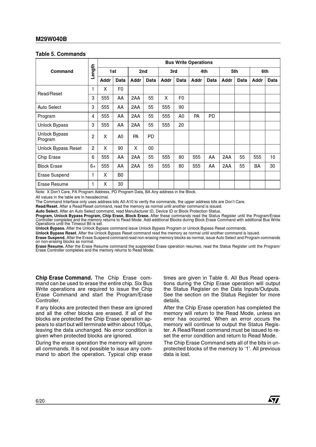M29W040B Table 5 Commands Bus Write Operations Command 1st 2nd 3rd 4th 5th 6th Addr Data Read/Reset Auto Select