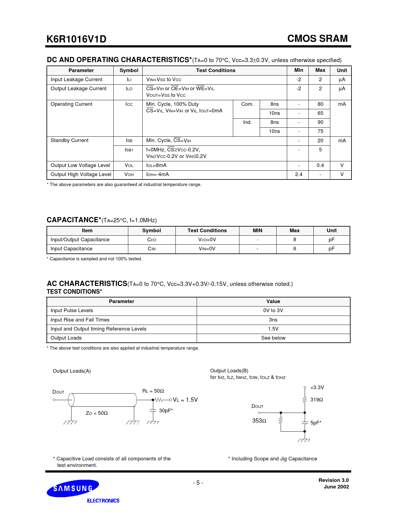 for AT&T. K6R1016V1D. CMOS SRAM. DC AND OPERATING CHARACTERISTICS*. Parameter. Symbol. Test Conditions. Min. Max. Unit. CAPACITANCE*