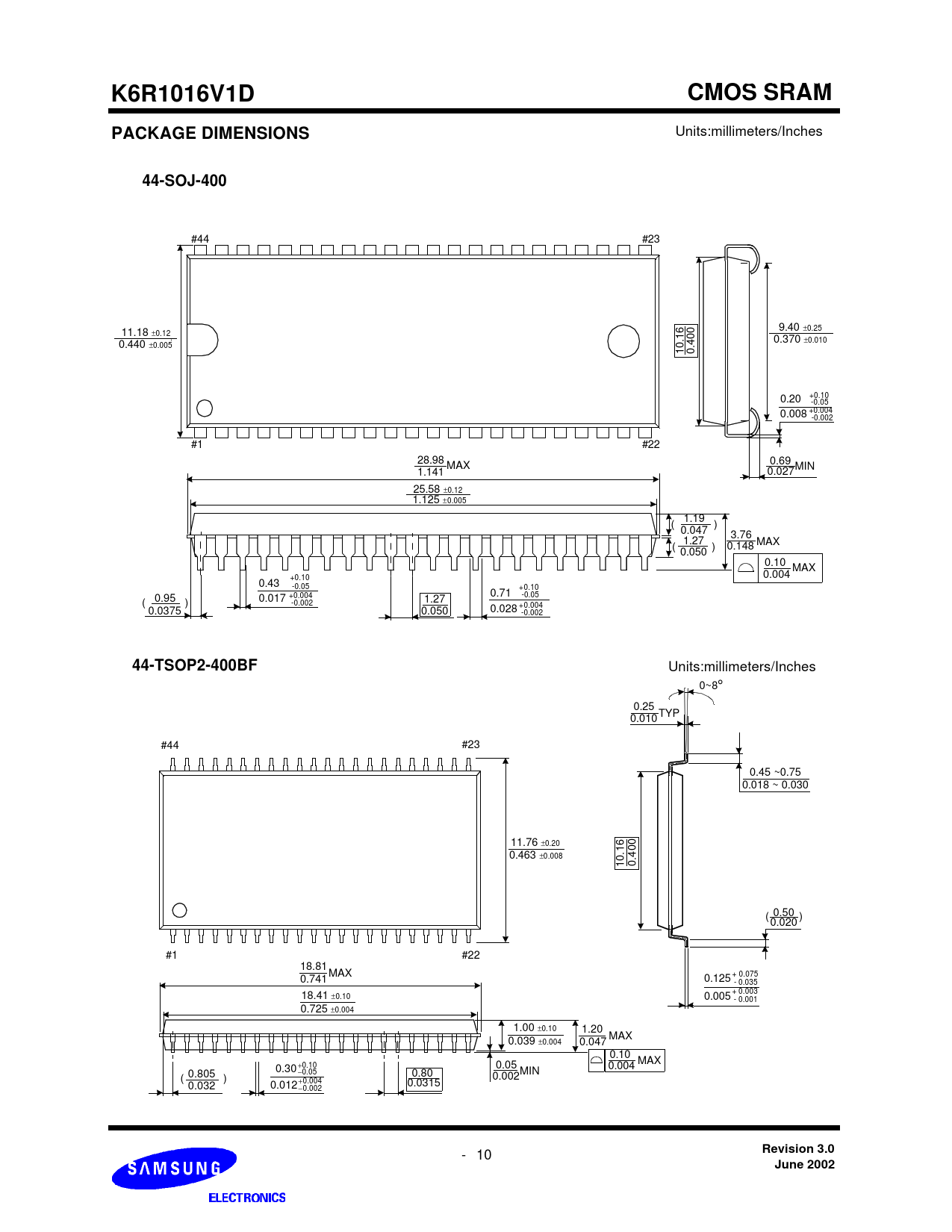 for AT&T. K6R1016V1D. CMOS SRAM. PACKAGE DIMENSIONS. 44-SOJ-400. 44-TSOP2-400BF. Revision 3.0. June 2002